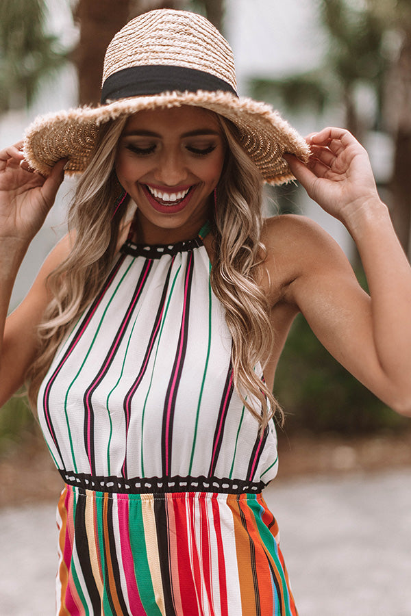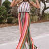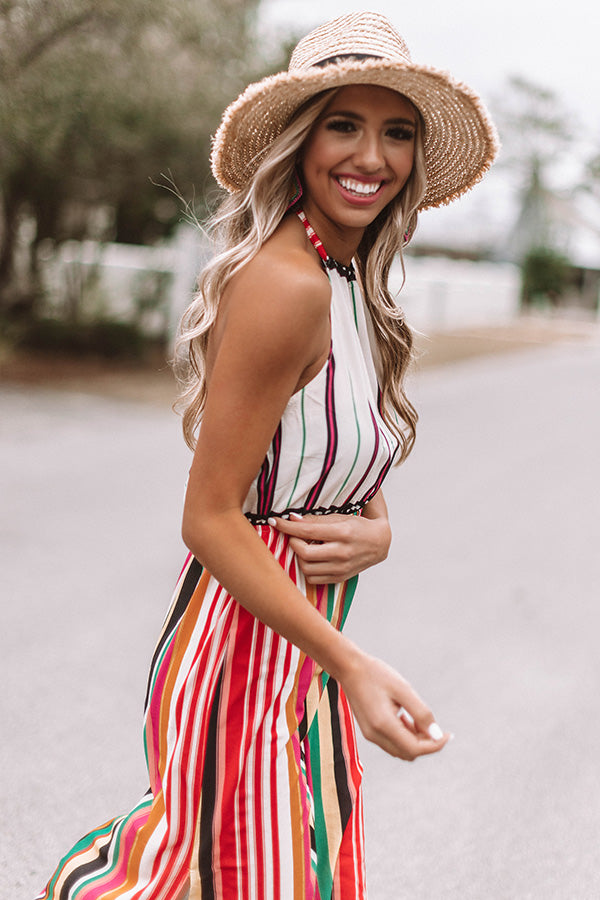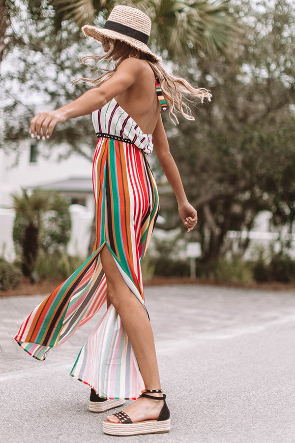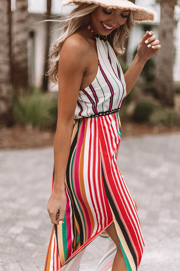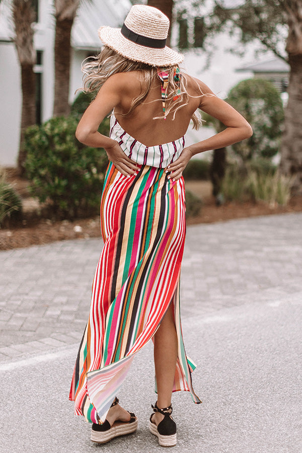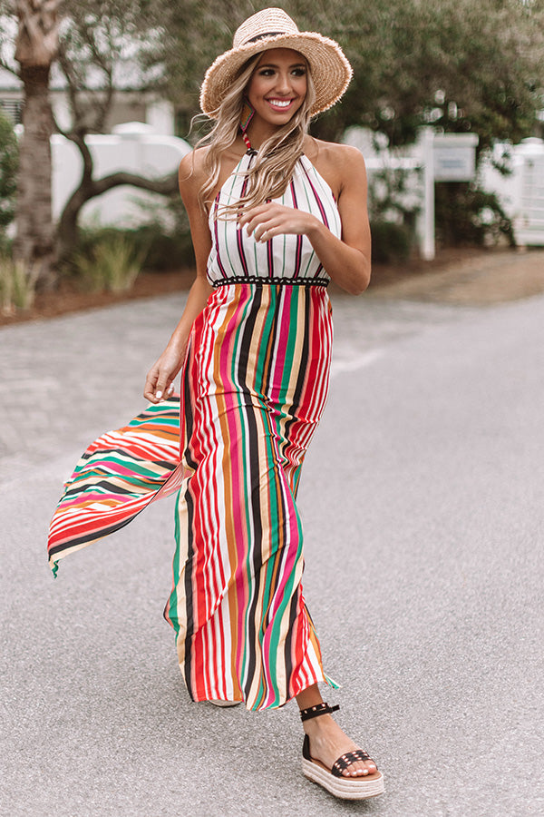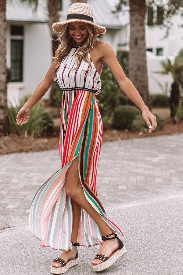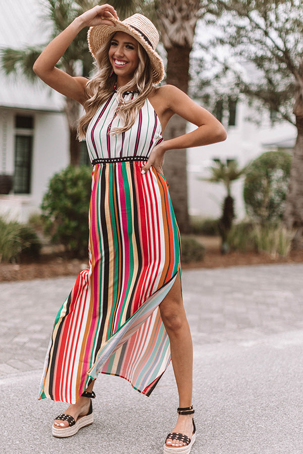This colorful maxi dress features a breezy, lightweight shift material with contrasting stripes that lead into a tie back halter bodice with an elasticized waist. With a flowing full maxi skirt with two side slits for an added sassy touch!