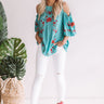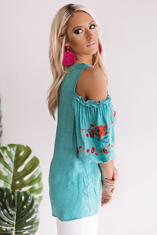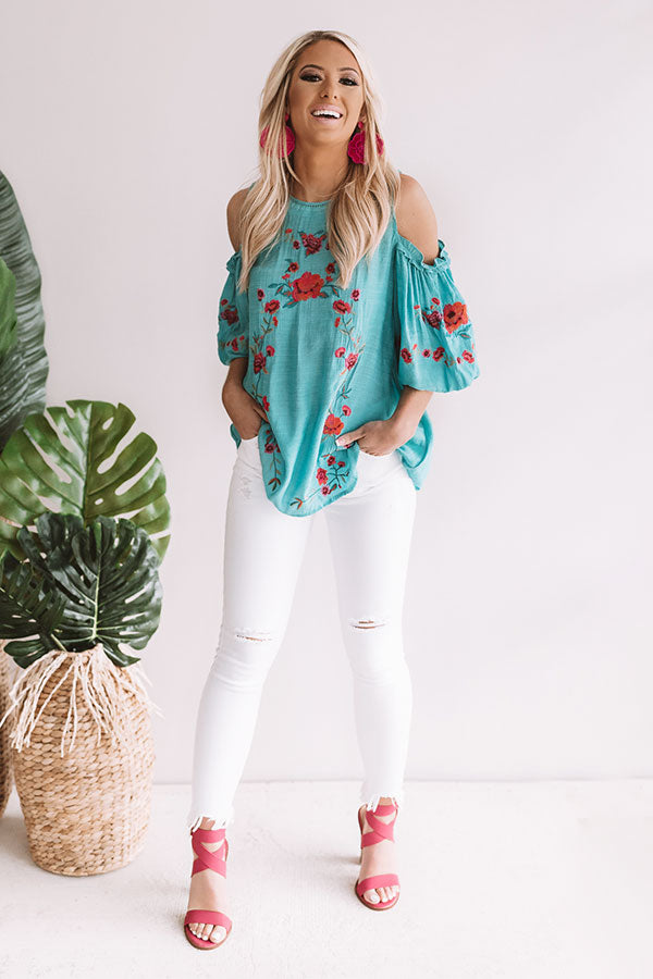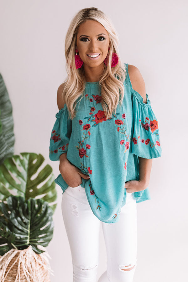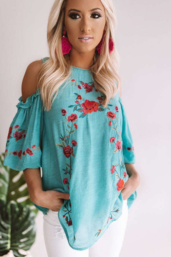 Paradise is calling -- all you need is a plane ticket... and this cold-shoulder cutie! This turquoise shift top has blousy cold-shoulder sleeves, keyhole accented upper back with button closure, and a relaxed floral embroidered bodice that you're sure to adore! Throw on a colorful statement earring and your favorite denim for a chic look that is sure to be the life of every party!