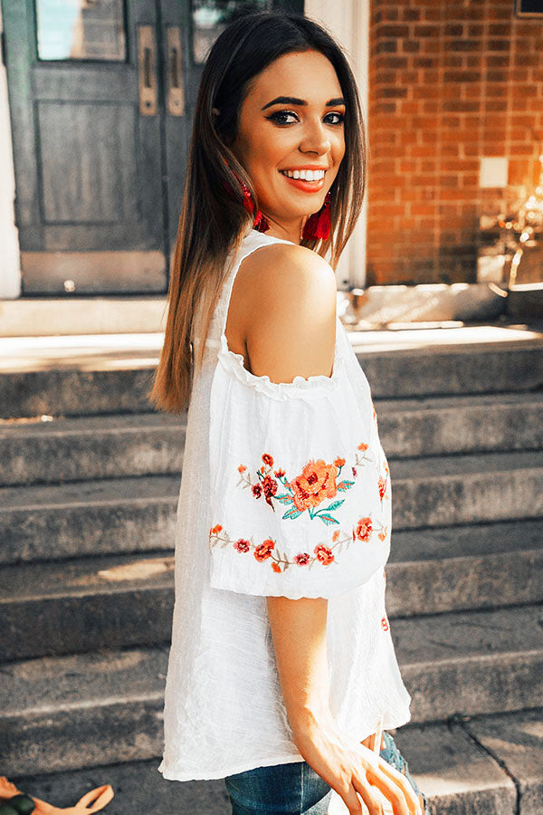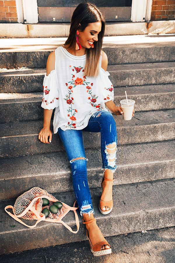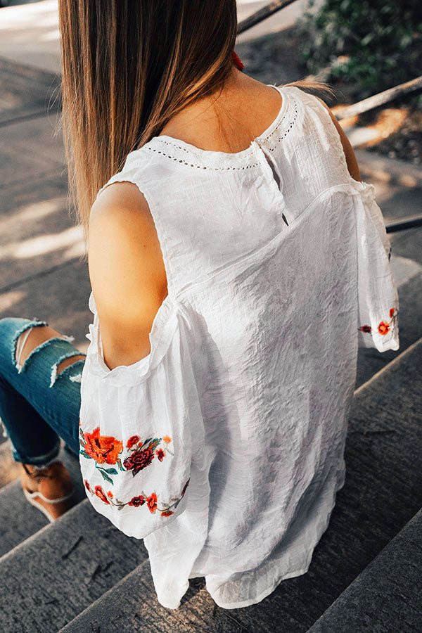Paradise is calling -- all you need is a plane ticket... and this cold-shoulder cutie! This white shift top has blousy cold-shoulder sleeves, keyhole accented upper back with button closure, and a relaxed floral embroidered bodice that you're sure to adore! Throw on a colorful statement earring and your favorite denim for a chic look that is sure to be the life of every party!