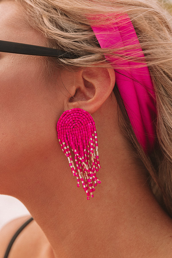 These adorable hot pink statement earrings will have you feeling like you just stepped into paradise with their large half moon studs and long beaded tassels with gold accents!