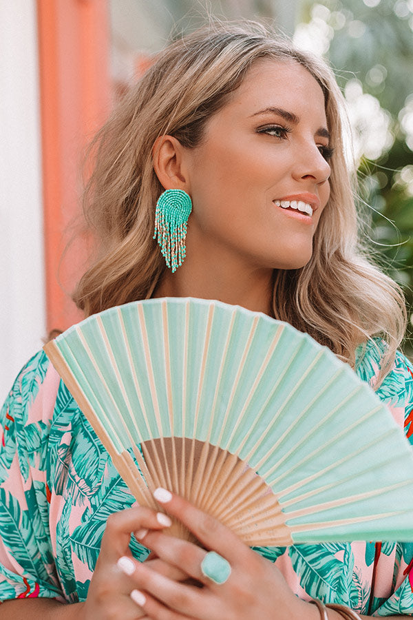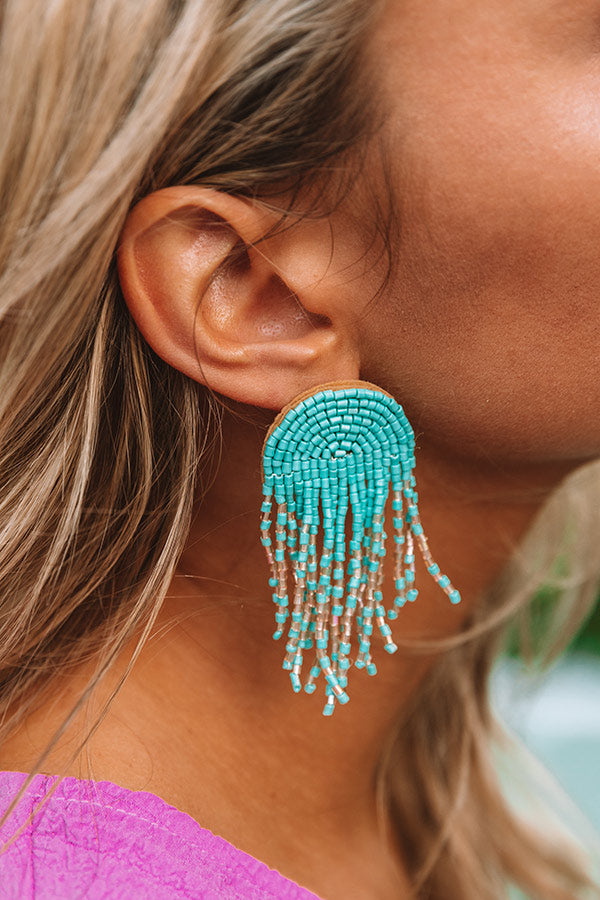 These adorable turquoise statement earrings will have you feeling like you just stepped into paradise with their large half moon studs and long beaded tassels with gold accents!