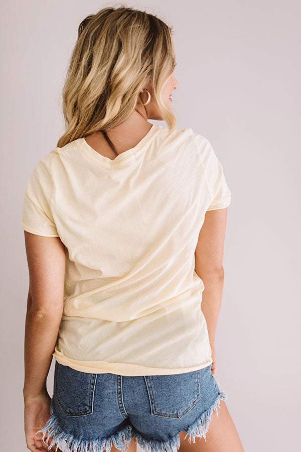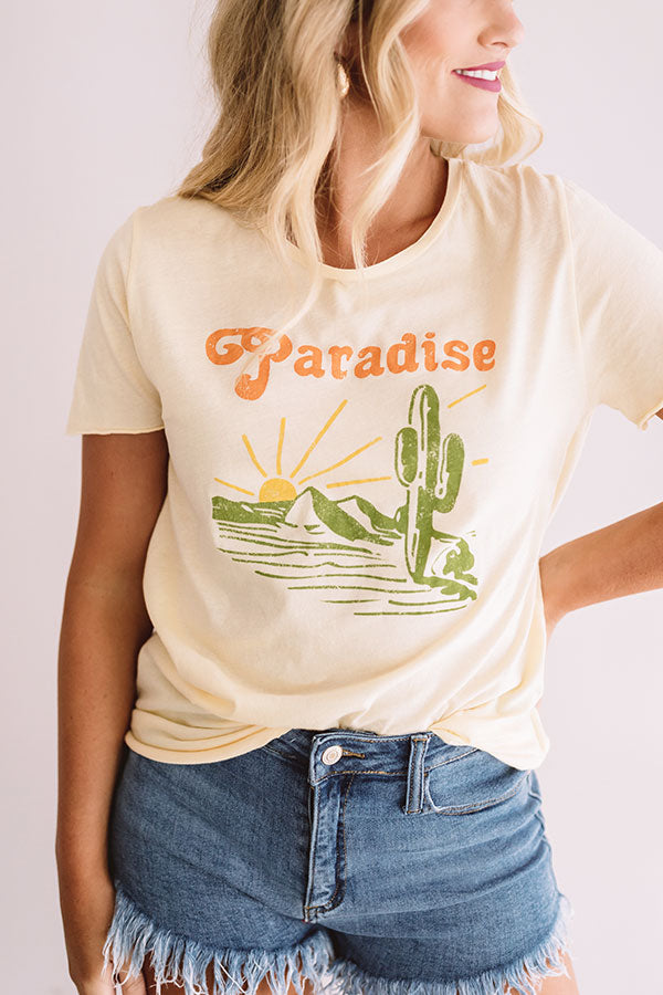 You will have nothing but "paradise vibes" in this pastel graphic shift tee with its orange bubble lettering and green desert scene on the front! This stylish top can be styled with frayed denim shorts or skinnies, or our "Everleigh High Waist Flares in Charcoal," camel wedges or a trendy sneaker and a fringe crossbody or "The It List Backpack in Sage!" Measurements