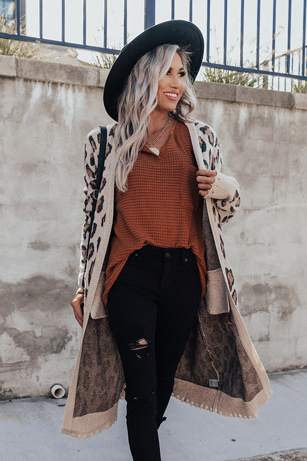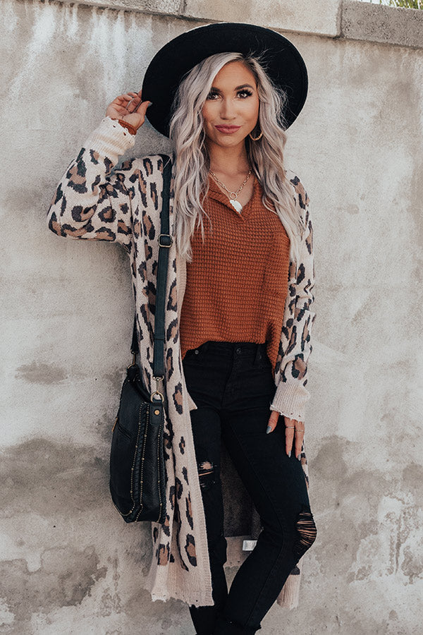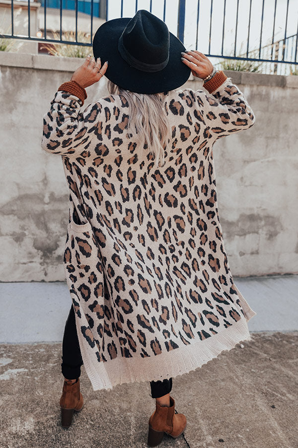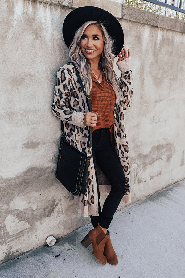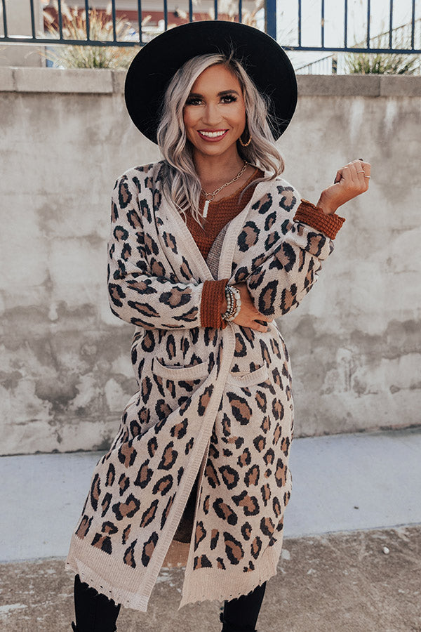 We have no doubt this gorgeous cardigan will provide you with paramount comfort and warmth with its ultra soft lightweight tight knit material, bold black and brown leopard print, long loose sleeves with fitted cuffs, low accent pockets, and an ultra draped open front silhouette that cascades into a straight mid-calf length hemline!