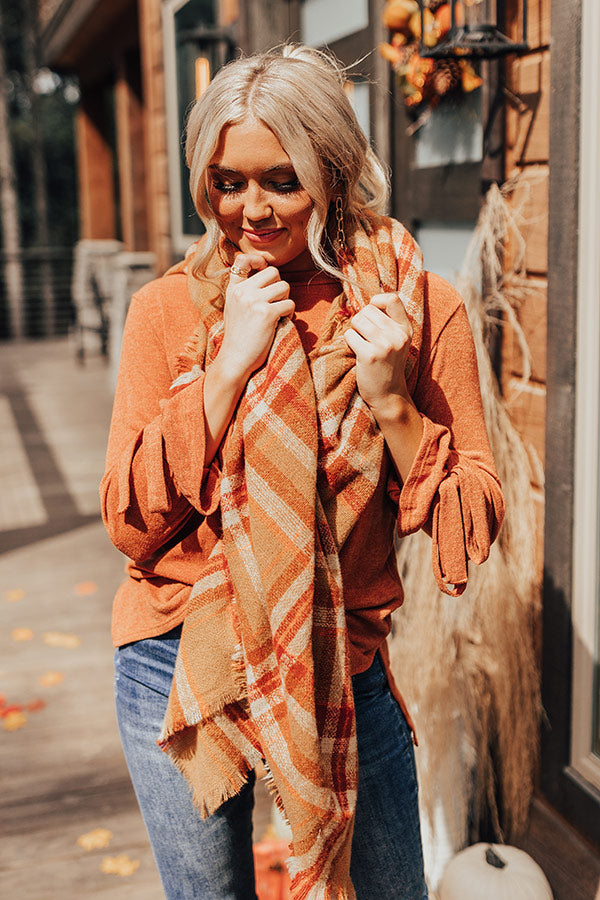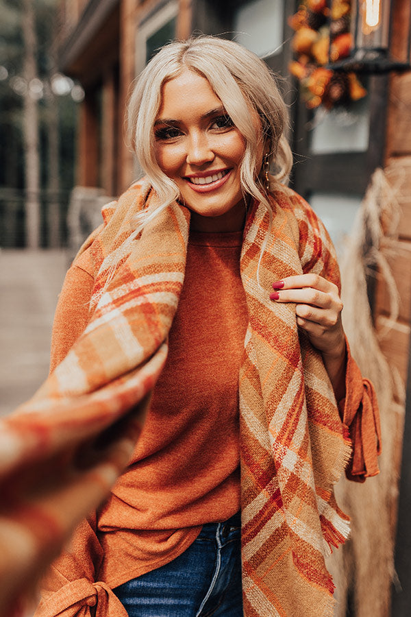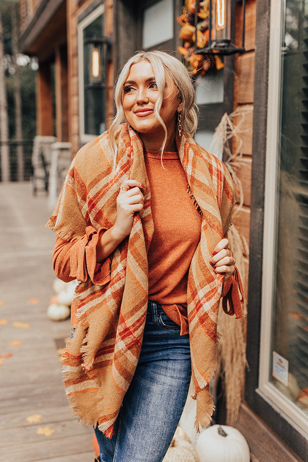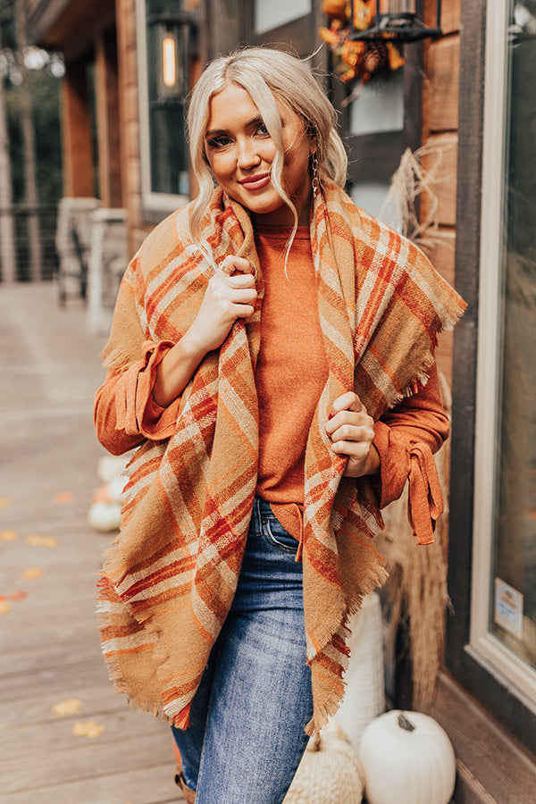 Don't hesitate to wrap yourself in warmth with our timeless camel colored 'Paris Cafe Blanket scarf' featuring lightweight but warm material patterned with a brown, cream, and orange plaid print with frayed trim detailing!