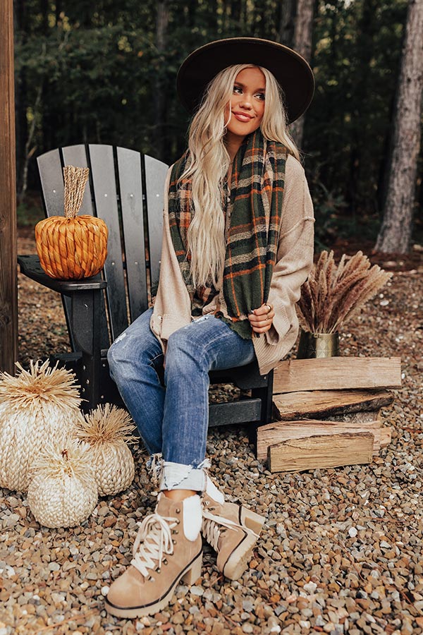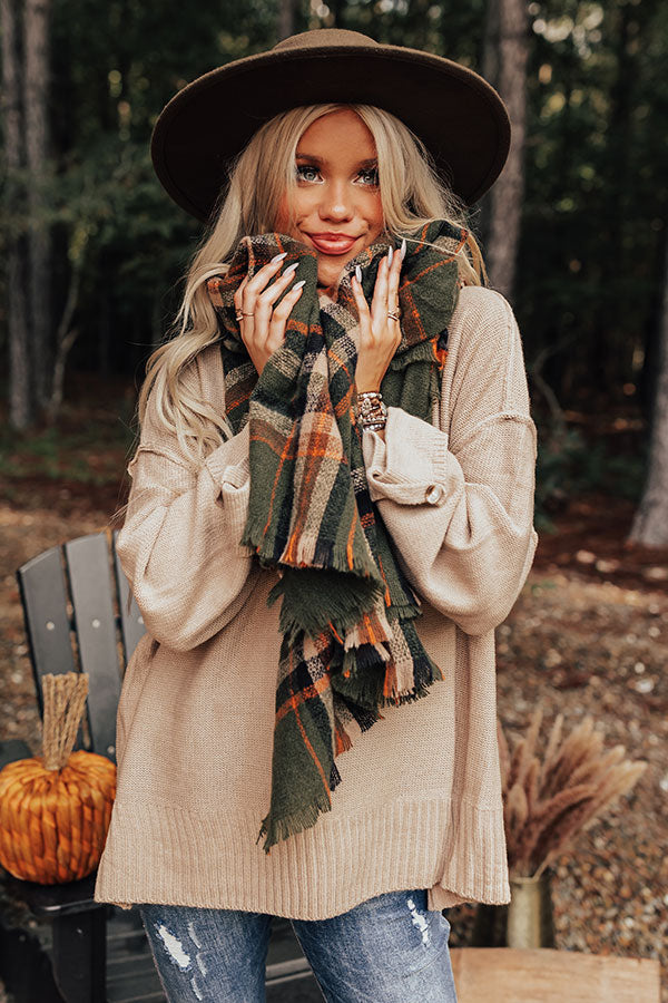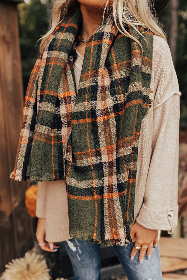 Don't hesitate to wrap yourself in warmth with our timeless olive colored 'Paris Cafe Blanket scarf' featuring lightweight but warm material patterned with a black, cream, and orange plaid print with frayed trim detailing!