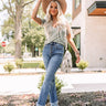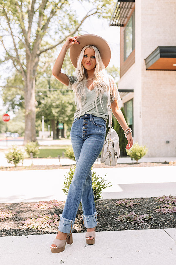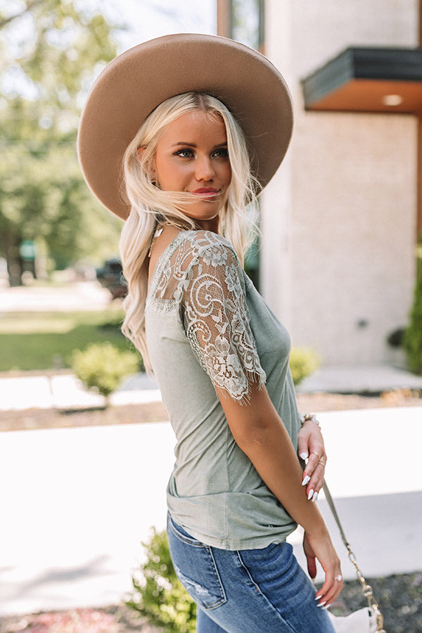 If you are a jeans and t-shirt kind of girl, but still want to look chic then this adorable sage colored top is just for you! It features lightweight material, a v-cut neckline, short semi sheer sleeves with intricate lace detailing, and a relaxed silhouette that falls into a straight hemline! Measurements