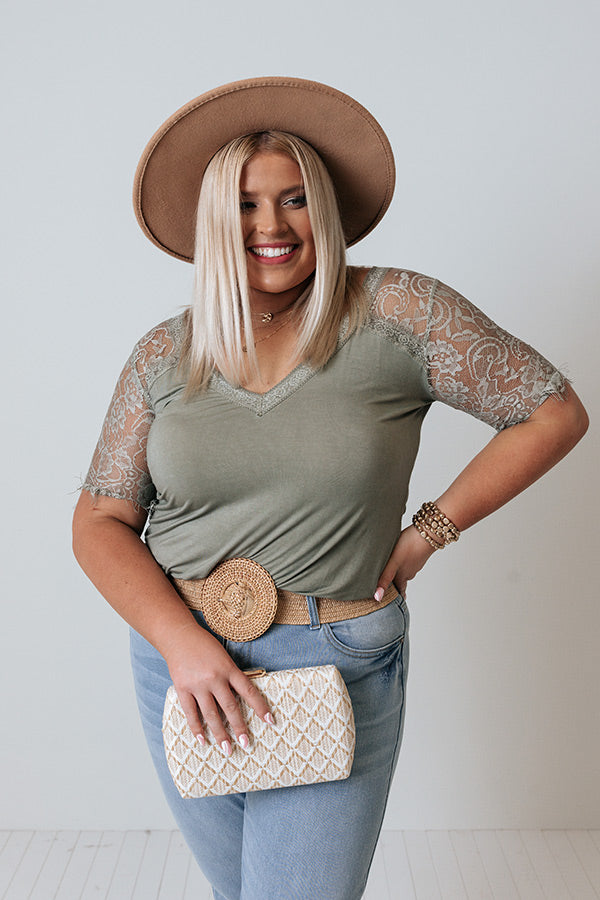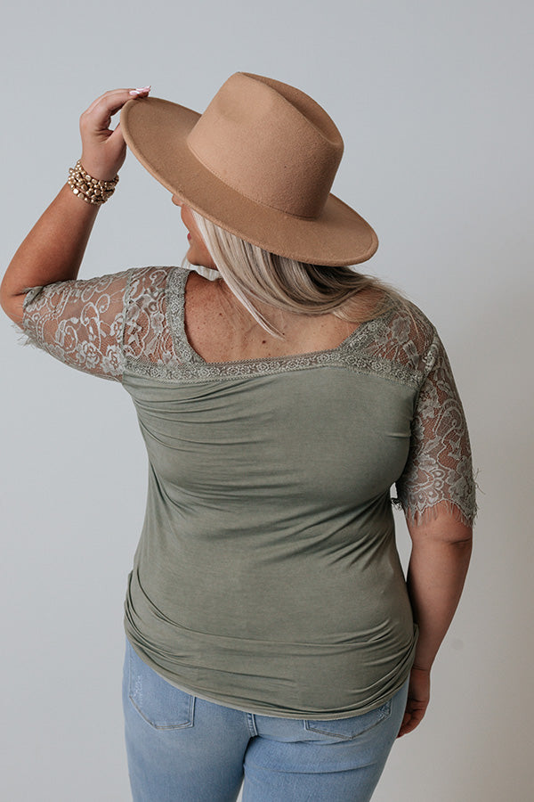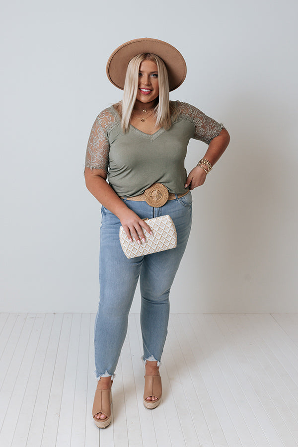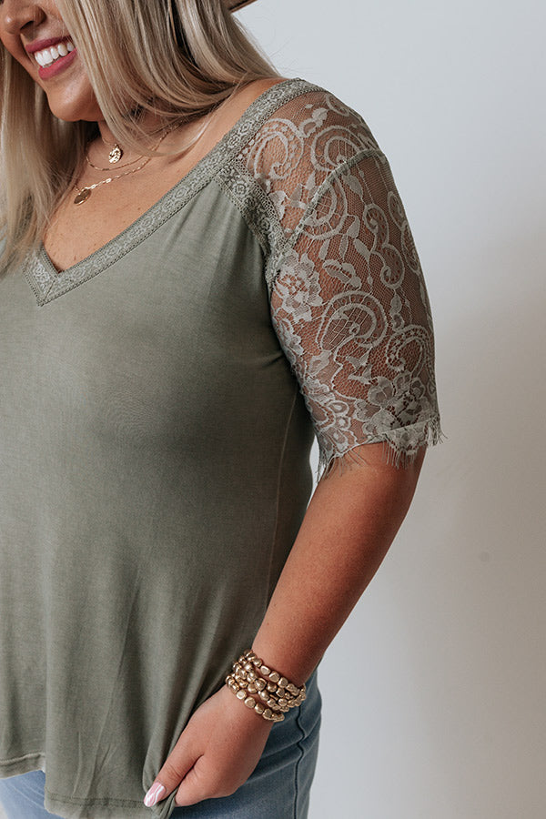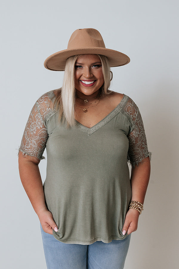 Plus Size - If you are a jeans and t-shirt kind of girl, but still want to look chic then this adorable sage colored top is just for you! It features lightweight material, a v-cut neckline, short semi sheer sleeves with intricate lace detailing, and a relaxed silhouette that falls into a straight hemline! Measurements