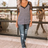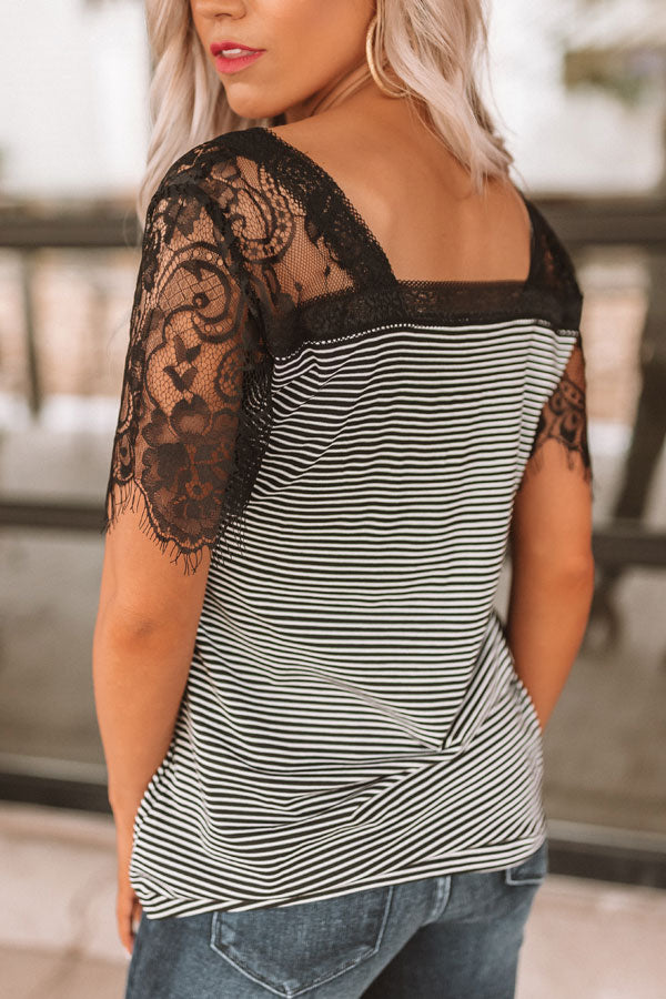 If you are a jeans and t-shirt kind of girl, but still want to look chic then the "Paris Luxe" top is just for you! It features sheer lace short sleeves, a v-cut neckline, a square cut upper back, and a black and white striped bodice that falls into a straight hemline! You can dress this piece down with some distressed ankle skinnies and a black peep toe bootie, or you can style it up when you pair it with our "Weekend In NYC Ribbed Velour Skirt in Black," "Better With Vino Cardigan in Wine," and "The Rose Faux Suede Boot in Black" for an OOTD that is casual but has a fancy personality! Measurements