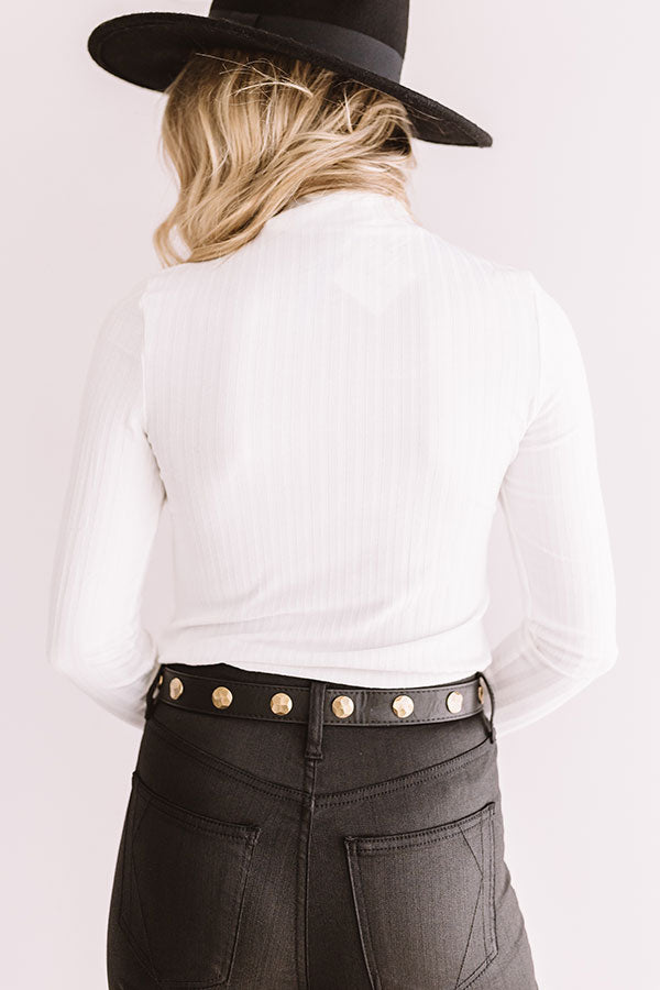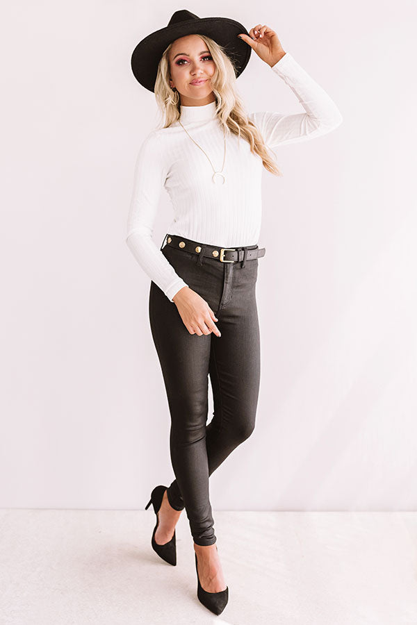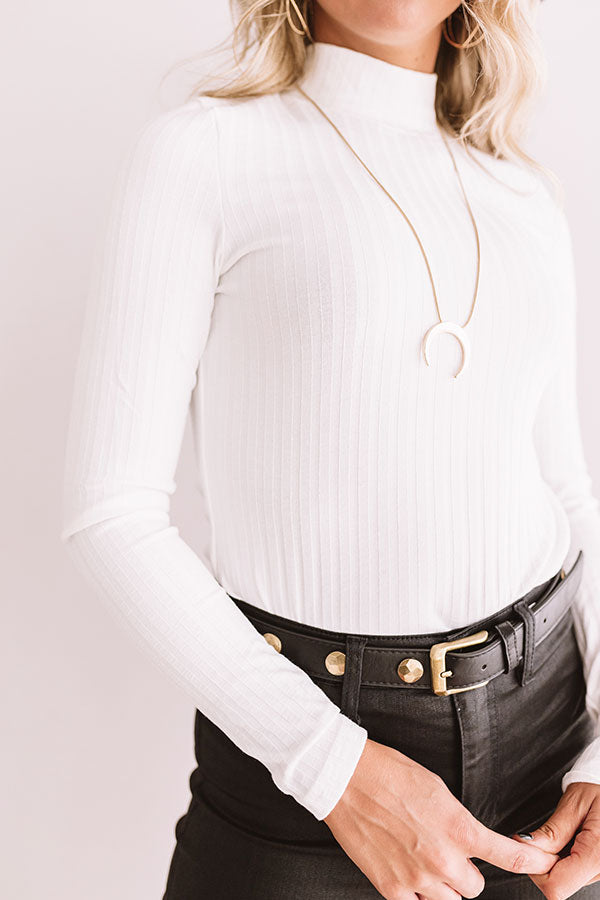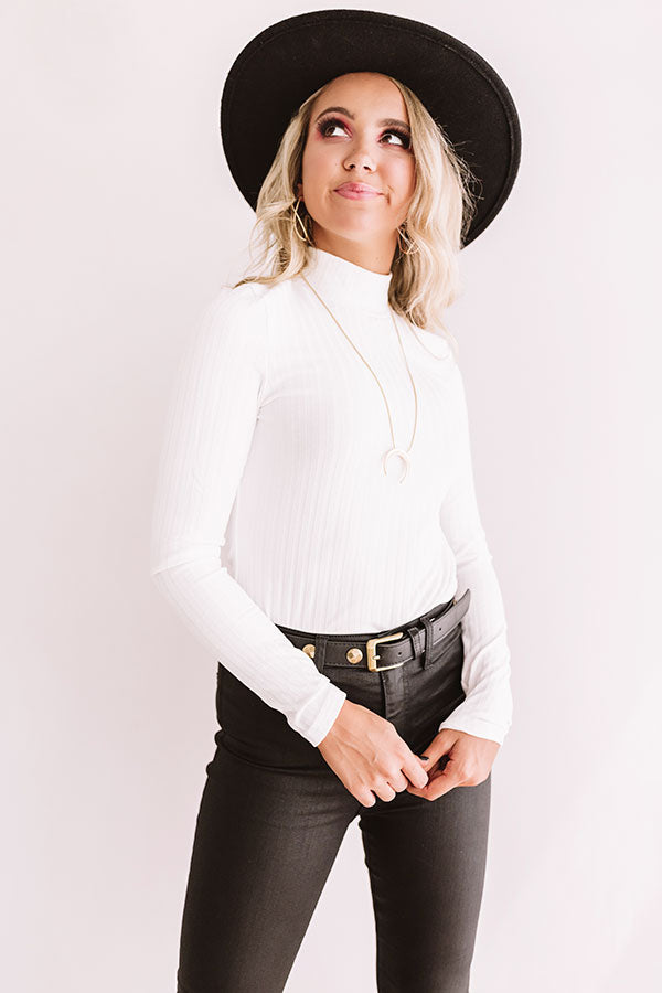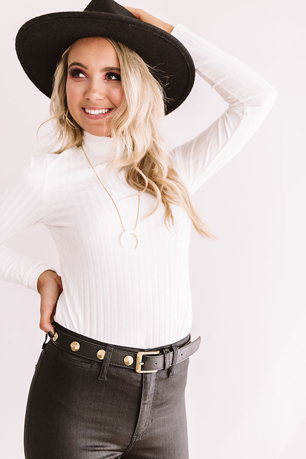 There is no better piece to wear for those amazing "Paris nights" than this adorable white top featuring lightweight stretchy material with ribbed texturing, long sleeves, a high turtle neckline, and a form fitting silhouette that falls into a straight hemline! We have styled this basic cutie tucked into faux leather skinnies with a black pump, statement belt, and faux suede hat, but you can also wear it layered under a distressed denim jacket with charcoal flares, "The Seraphina Faux Leather Wedge in Grey," and our "Style Profile Faux Leather Tote in Grey!" Measurements