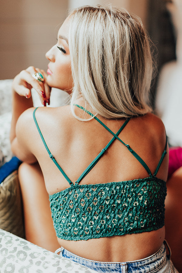 Add a femme and flirty touch to any look with our hunter green "Paris Premier" bralette featuring a fabric lined triangle cut bust, intricate lace detailing, twin adjustable spaghetti straps that cross over a smocked elastic back, and a wide waistband with a scalloped hemline! Layer this beautiful piece under any of your favorite tees or slouchy sweaters to add an irresistible twist to any outfit!