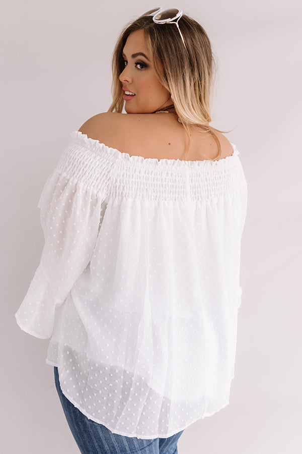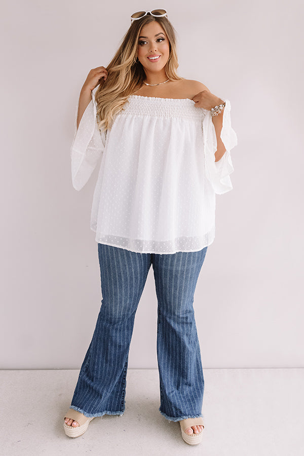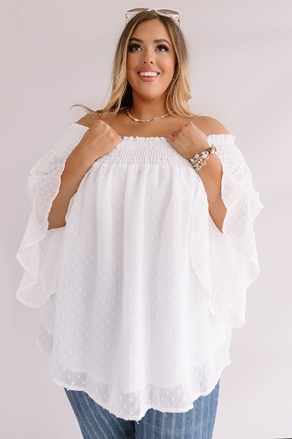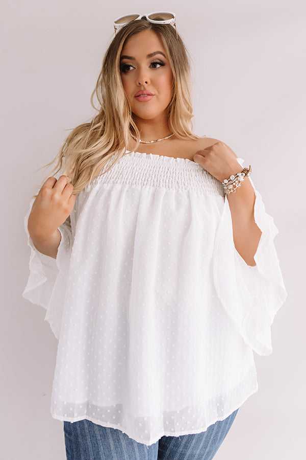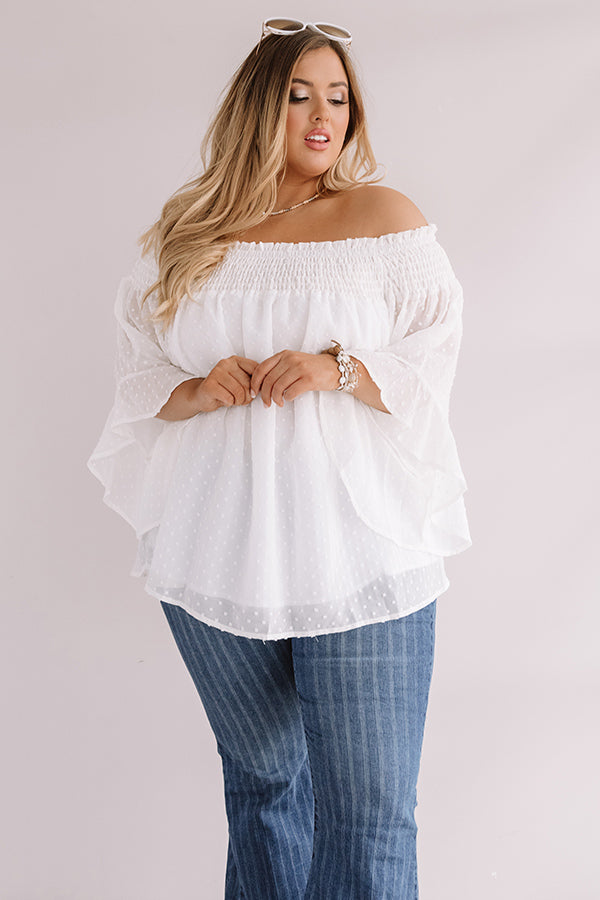 Plus Size - Be your own muse in our chic white "Paris Premier" shift top featuring ultra lightweight material patterned with a subtle polka dot texture, a smocked off-the-shoulder fit with a straight neckline, oversized 3/4-length sleeves with ultra flared cuffs, and a relaxed silhouette that falls into a rounded hemline! This adorable piece styles perfectly with some pin stripe flares, sunnies, and neutral wedges, but you can also wear it with some distressed light wash skinnies, "The Lela Espadrille in White," and our "Nightlife Luxury Snake Print Tote in White!" Measurements