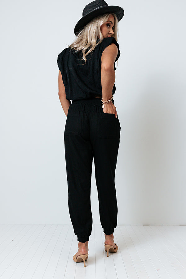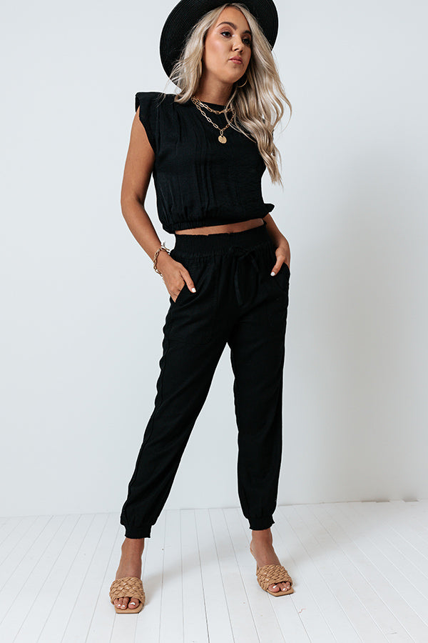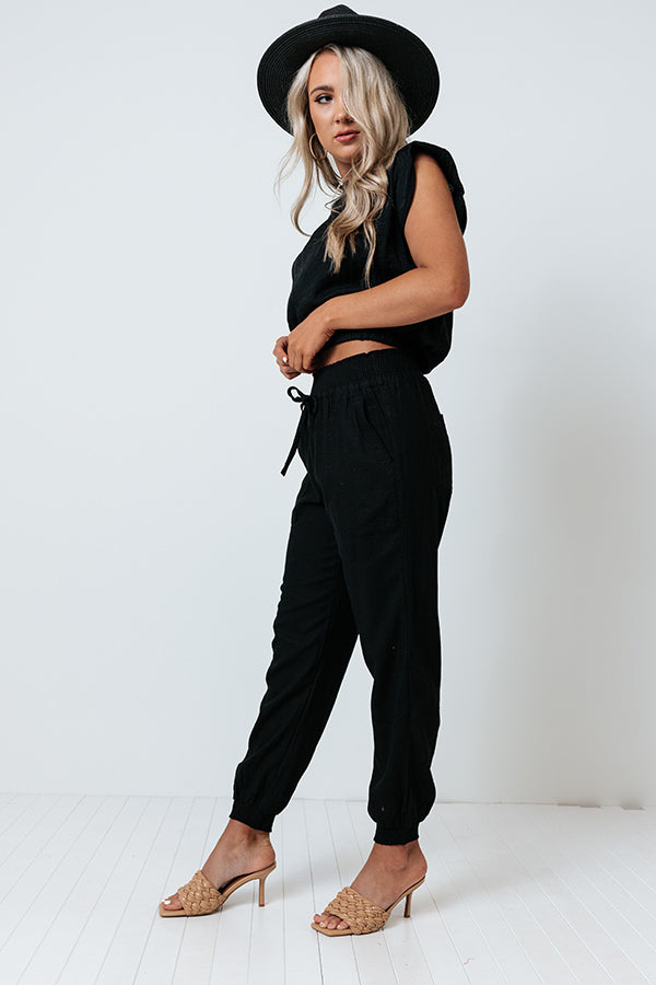 Stay on trend in our comfy cute black 'Parisian Countryside' joggers featuring lightweight material, a high smocked waist with a tie belt closure, two side pockets and two back pockets, and a slouched pants silhouette that tapers into fitted ankle-length hemlines! Measurements