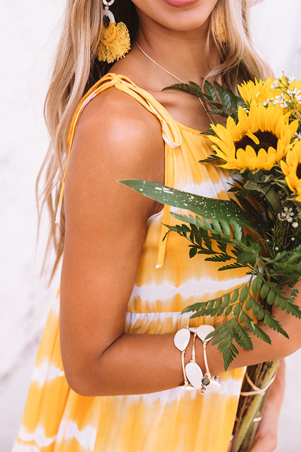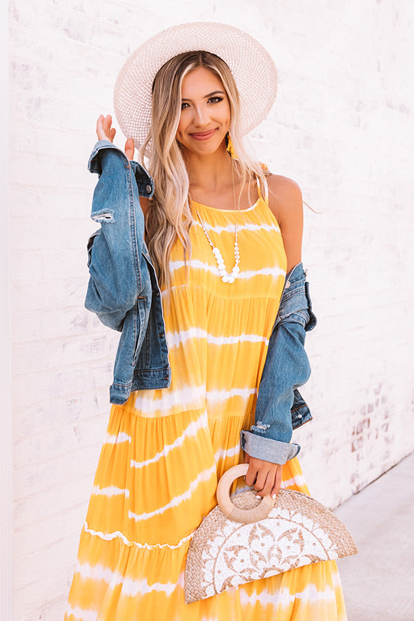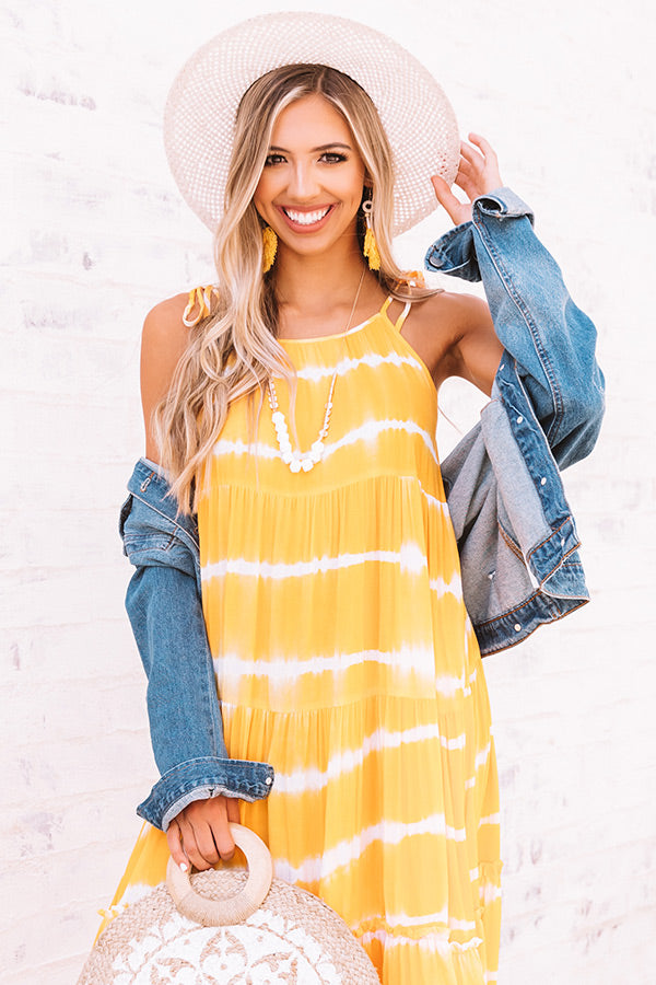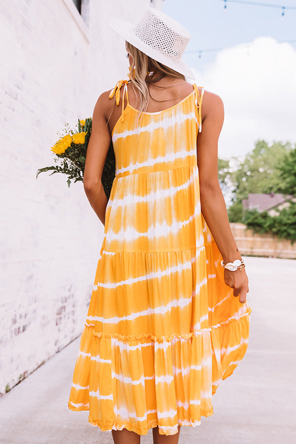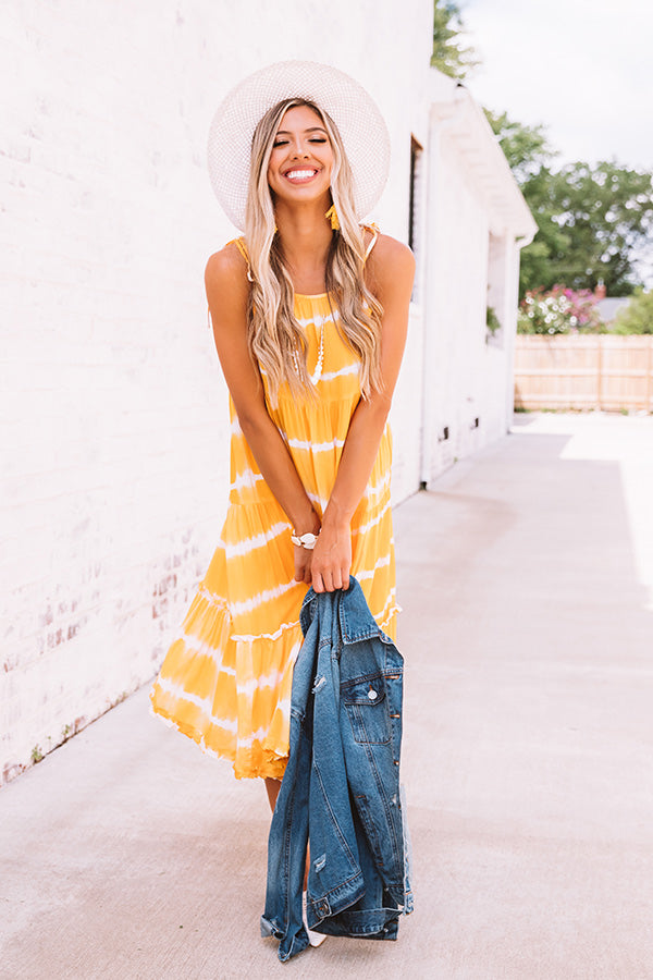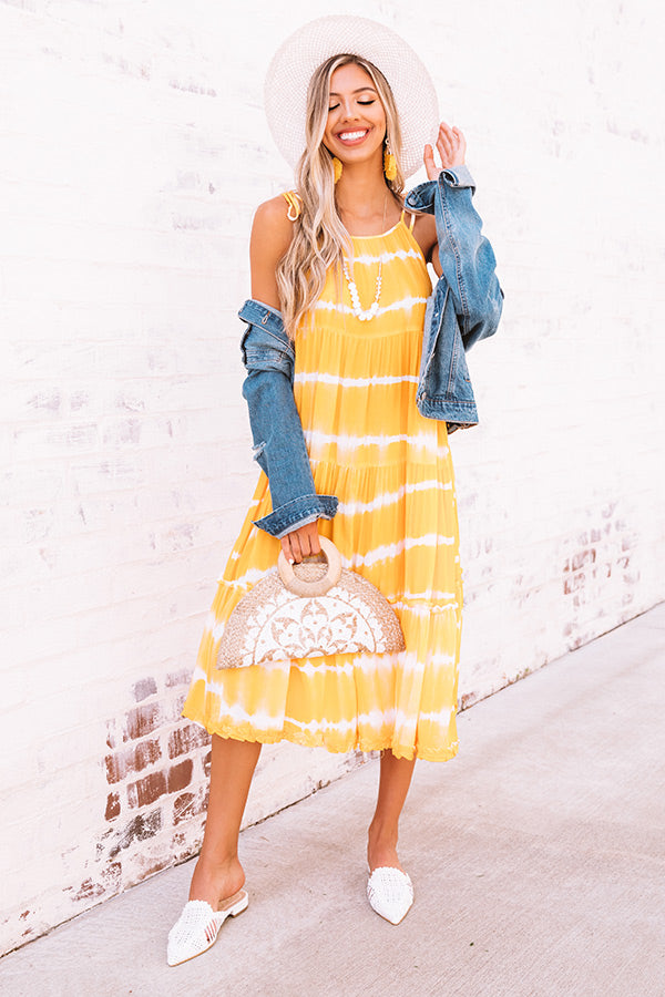 Twirl from season to season effortlessly with this charming golden honey colored midi dress featuring lightweight breezy material patterned with white horizontal tie dye accent stripes, a scooped neckline, spaghetti straps with shoulder tie closures, and an ultra relaxed tiered silhouette that falls into an uneven mid-calf length hemline! We have layered this cutie under a jean jacket with some matching statement earrings and a white woven flat and hat, but you can also wear it with "The Alaya Wedge in Golden Honey" and our "Cute Composer Woven Clutch in White!" Measurements