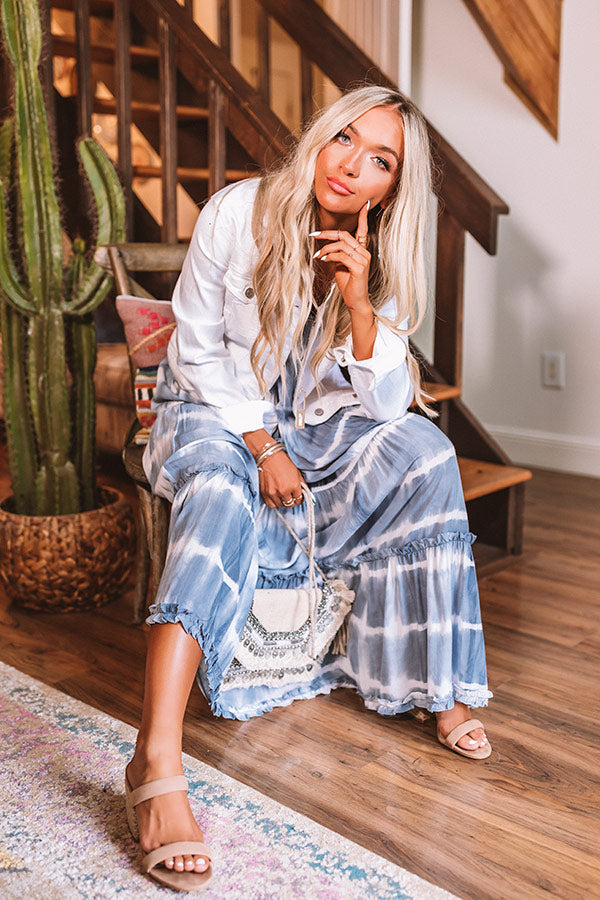 Twirl from season to season effortlessly with this charming slate colored midi dress featuring lightweight breezy material patterned with white horizontal tie dye accent stripes, a scooped neckline, spaghetti straps with shoulder tie closures, and an ultra relaxed tiered silhouette that falls into an uneven mid-calf length hemline! We have layered this cutie under a white jean jacket with an embellished clutch and neutral mule heels, but you can also wear it with "The Alba Wedge in Ivory" and our "Bay Of Bliss Woven Hat in White!" Measurements