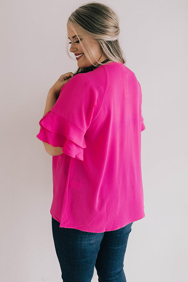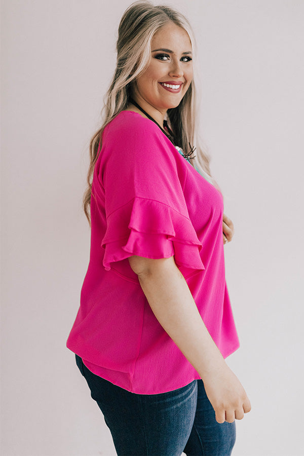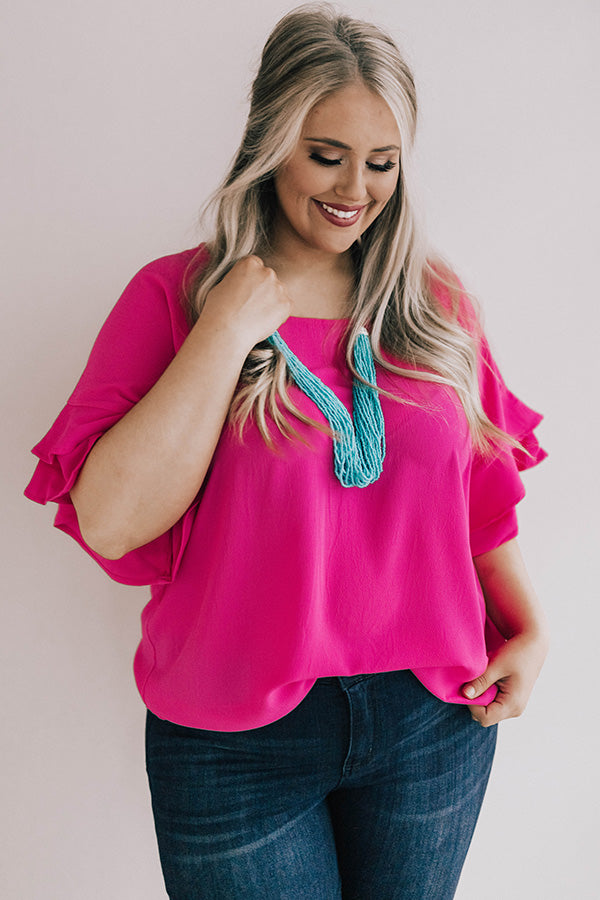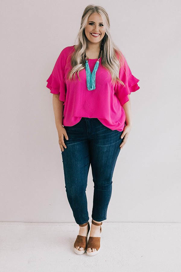 Plus Size - Bonjour, Beautiful! This sassy shift top has flirty tiered ruffle sleeves and an ultra breezy poly silhouette that is perfect for any occasion. Whether you're enjoying a pinot on the patio with your besties, or on a date, you are sure to look stunning in this femme and flirty top!