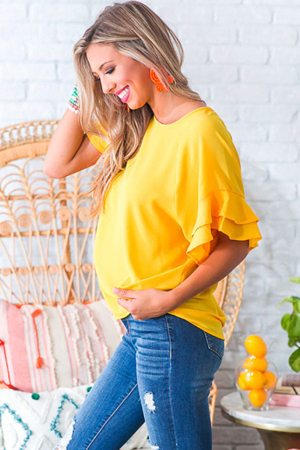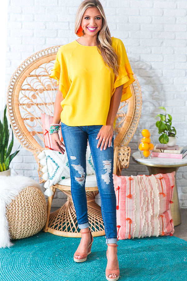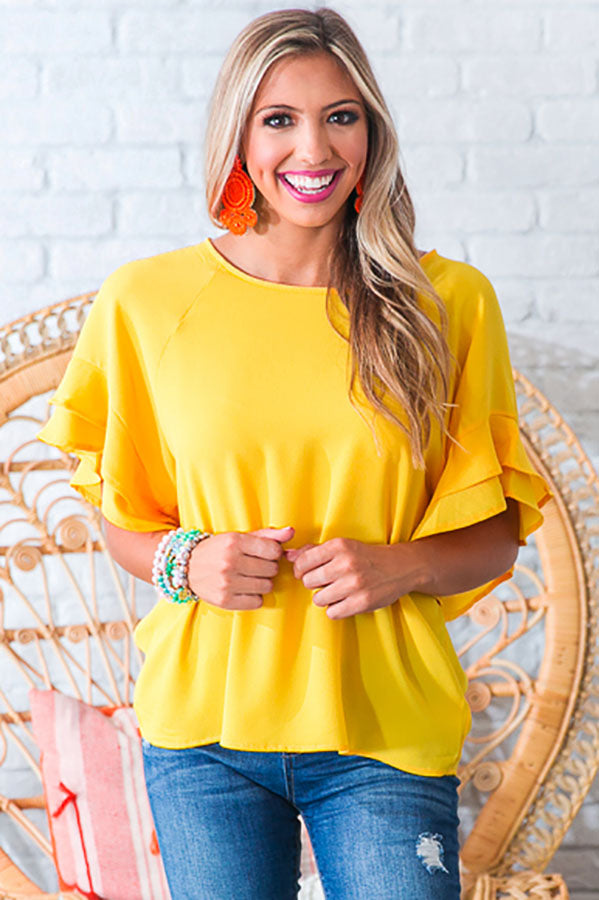 Bonjour, Beautiful! This sassy shift top has flirty tiered ruffle sleeves & an ultra breezy poly silhouette that is perfect for any occasion. Whether you're enjoying a pinot on the patio with your besties or on a date, you are sure to look stunning in this femme & flirty top!