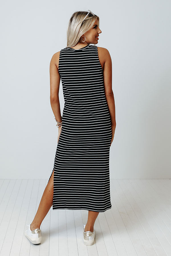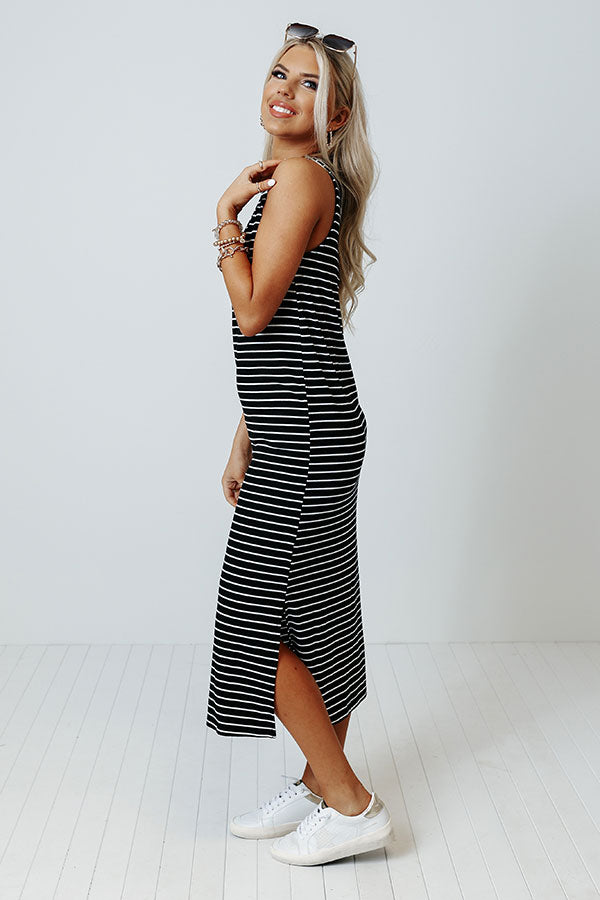 Get ready for patio weather with this black casual cute midi dress featuring soft and lightweight material patterned with white horizontal accent stripes, a rounded neckline with wide shoulder straps, and a relaxed silhouette that ends in a straight mid-calf length hemline with side slits! Measurements