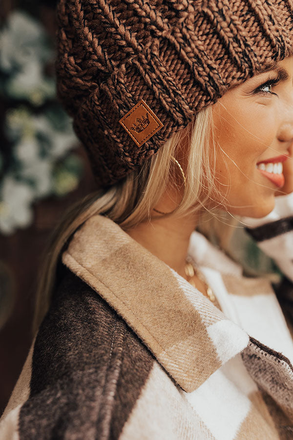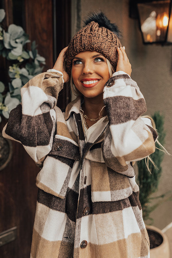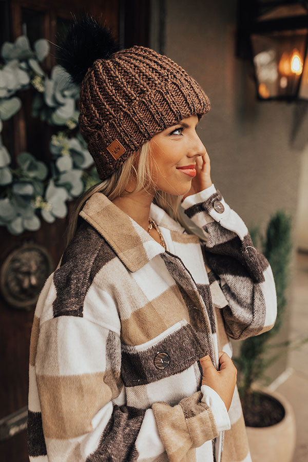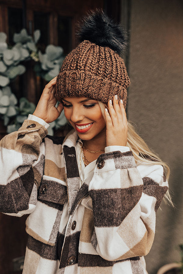 Stay stylishly warm in our cute brown 'Park City Slopes Beanie' featuring soft knit material lined with fleece, a rolled hemline, and a black faux fur pom pom!