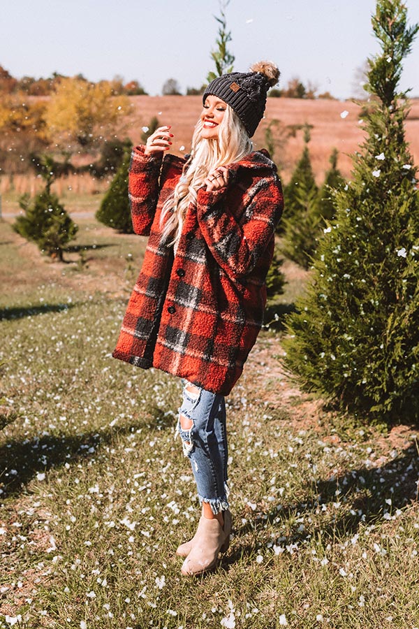 Don't let the cold weather keep you inside with our gorgeous 'Park City Snow' coat featuring ultra soft and warm sherpa material patterned with a red, black, and white plaid print, long loose sleeves, low accent side pockets, a collared flap neckline, and a draped open front silhouette that falls into a straight mid-thigh length hemline! Measurements
