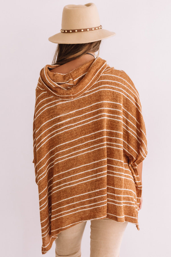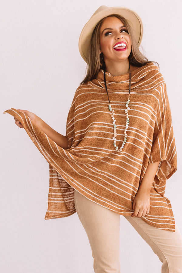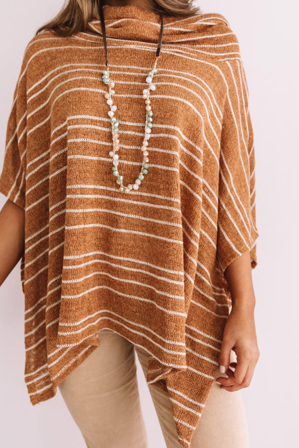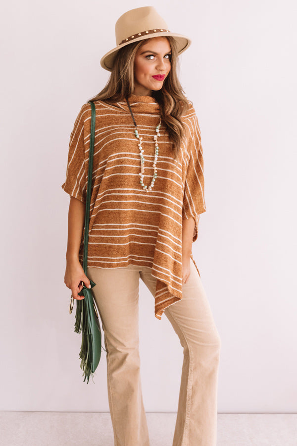 Wow them all this fall in our orange hued "Park Place" shift sweater featuring lightweight loose knit material with horizontal white accent stripes, a high oversized turtle neckline, loose half-length bat wing sleeves, and an ultra draped silhouette that falls into straight tunic length hemline with high side slits! We have styled this piece with some khaki flares, long statement necklace, a green fringed crossbody, and a neutral pointed wedge and faux suede hat, but you can also wear it with some distressed ankle skinnies and "The Miller Faux Leather Bootie in Beige!"