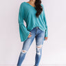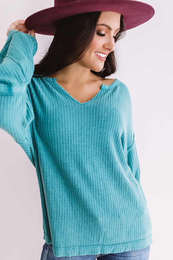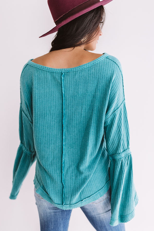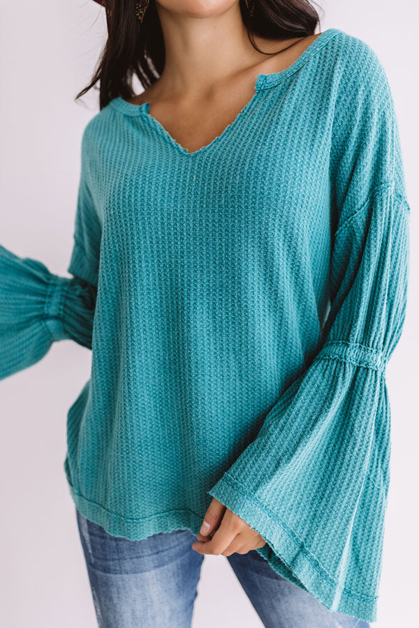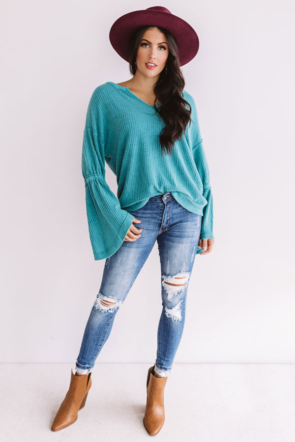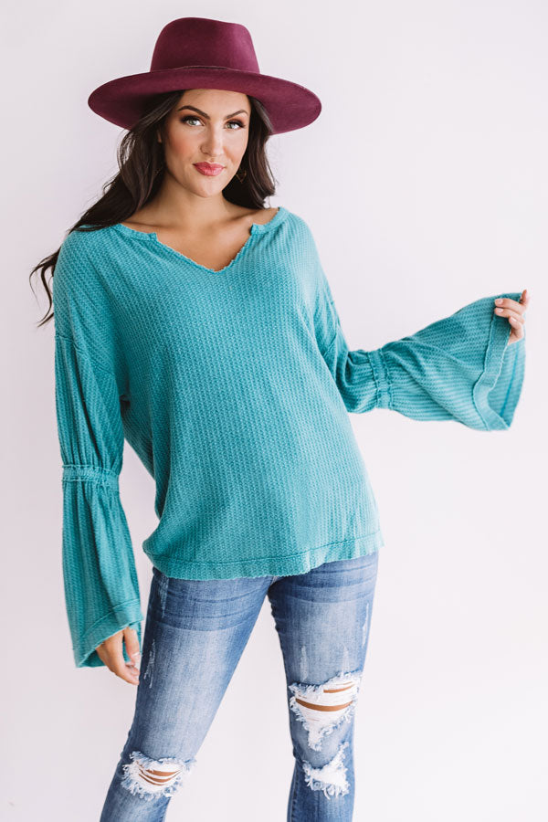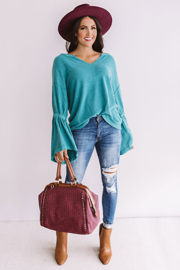 There is not a better piece to wear when meeting with your "partner in wine" than this jade top adorned with a waffle knit texture, a rounded neckline with a v-cut notch, long sleeves that flare at the elbow, exposed fresh cut seams, and a relaxed bodice that falls into a rounded hem that looks great tucked in! You can style this piece with some distressed ankle skinnies, a colored faux suede hat, and neutral booties, or you can pair it with some white flares and grey accents like our "Ready For Vacay Earrings" and "The Seraphina Faux Leather Wedge!" Measurements