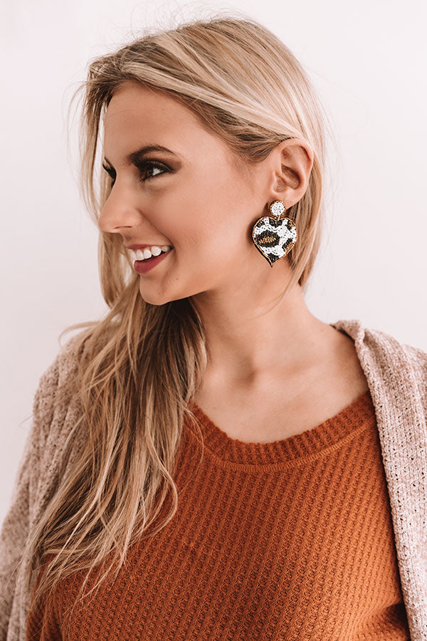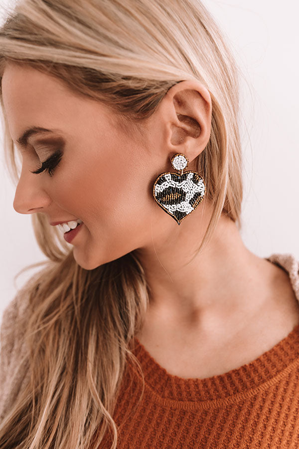 Add a shimmering flare to any OOTD with our beaded "Party Anthem" statement earrings featuring circle studs and dangling black, brown, and white leopard print heart pendants!