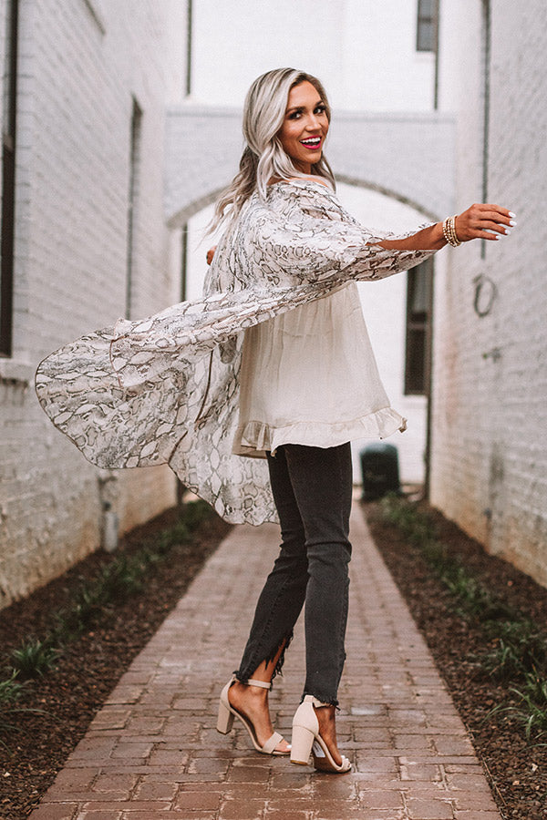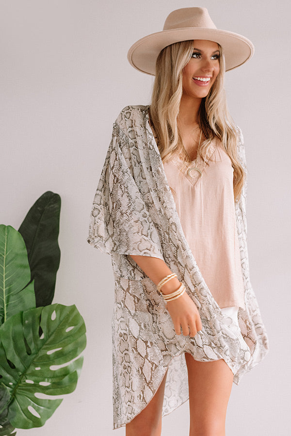 Breeze into summer in style with our "Party Anthem" overlay featuring ultra lightweight semi-sheer material patterned with a brown hued snake print, oversized half sleeves, and a relaxed open front silhouette that falls into an uneven knee length hemline with high accent side notches! You can layer this ultra warm and versatile piece with just about anything from a basic tank to a sweater, jeans to skirts or dresses, booties to wedges or sandals, clutches to totes, and hats to earrings! Measurements