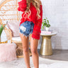 Keep it breezy in this red top with an elasticized crochet detailed off-the-shoulder neckline, long crochet-accented sleeves, and a lightweight relaxed bodice! Take your look to the next level with a sassy neutral wedge and your favorite denim shorts or with our "Fashion Week Flare Pants in White," a leopard crossbody, and "The Marlow Espadrille in Leopard" for an outfit that will have you yelling "party in my cabana" because you never want to take it off!
