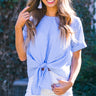 This sweet seersucker top has us dreaming of picnics in the park & patio parties! This blue & white seersucker top has a round neckline, short cuffed sleeves, sassy button-down back & a trendy tie bottom hem. Style with white skinnies or shorts for a preppy polished look that won't disappoint.