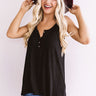 You won't find a better basic than the 'Party Perfection' black henley tank featuring lightweight material, subtle ribbed texturing, spaghetti straps, a button up bodice with a scooped neckline, and an ultra relaxed silhouette that falls into a straight hemline! Measurements
