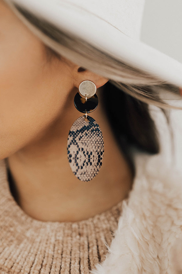 These brown earrings are sure to be a "party starter" with their gold circle studs and oval snake print dangles!