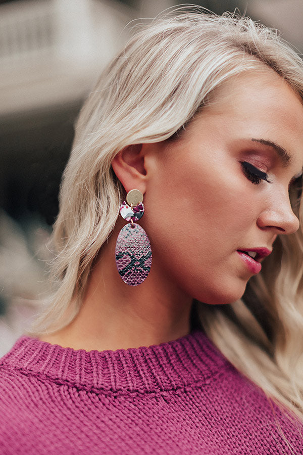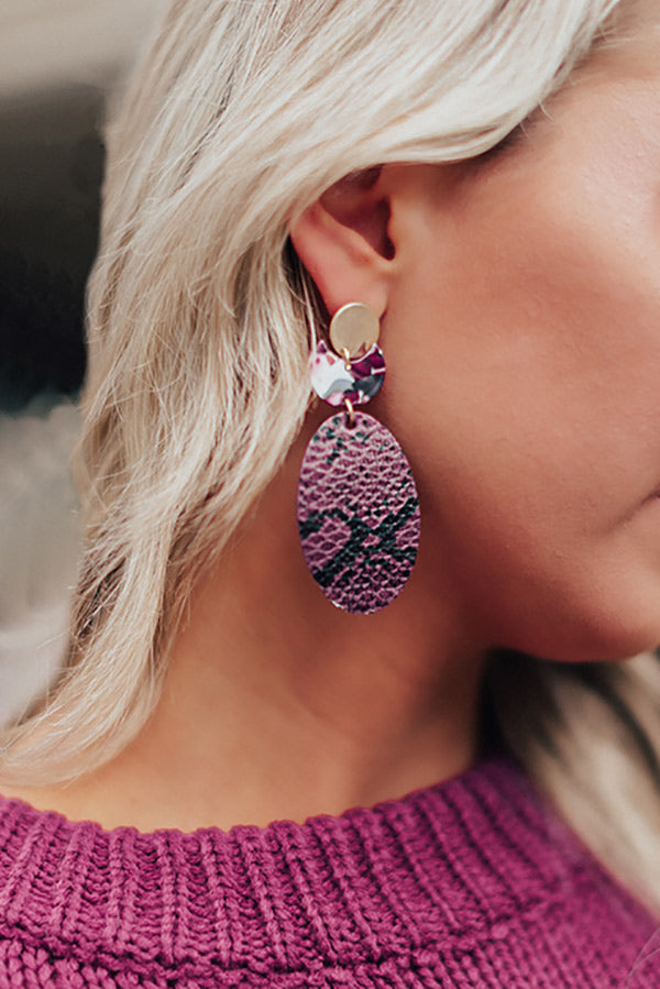 These purple earrings are sure to be a "party starter" with their gold circle studs and oval snake print dangles!