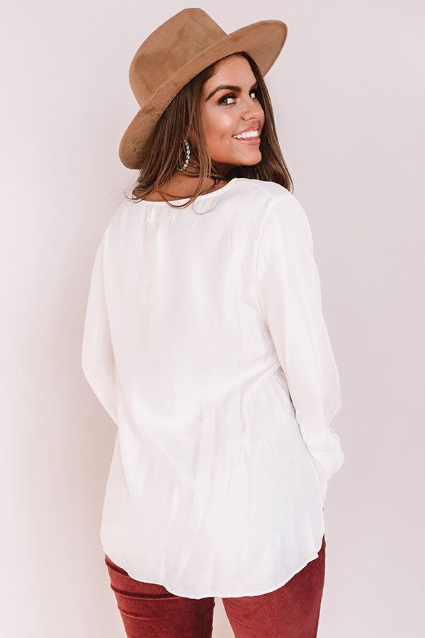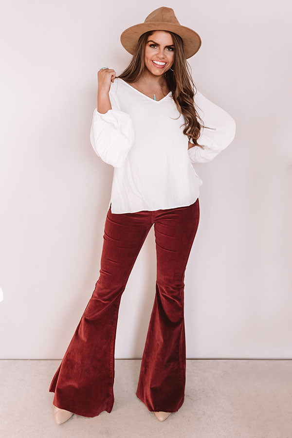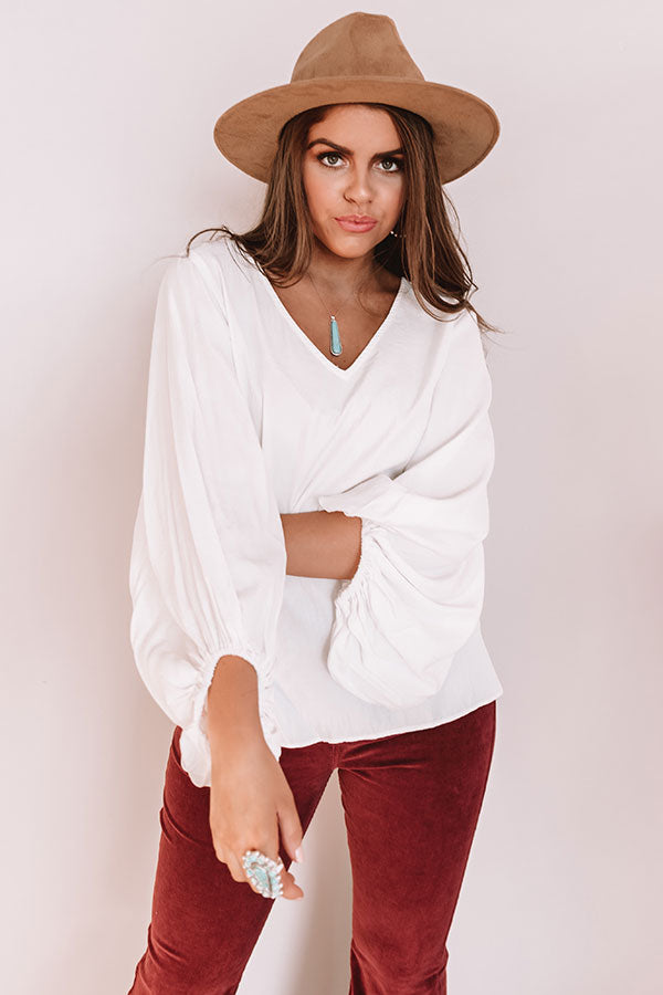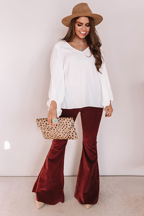 Make your OOTD look effortless with our white "Pass The Prosecco Shift Top" featuring lightweight breezy material, a wide v-cut neckline, long oversized bishop sleeves with fitted elastic banded cuffs, and a relaxed silhouette that falls into an uneven hemline! We have styled this piece with some wine colored flares, a cheetah print clutch, turquoise statement jewelry, and a neutral bootie and faux suede hat, but you can also wear it with some distressed ankle skinnies and "The Underwood Faux Leather Wedge in Natural!"