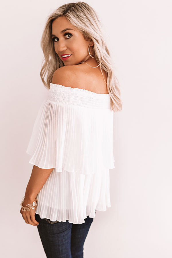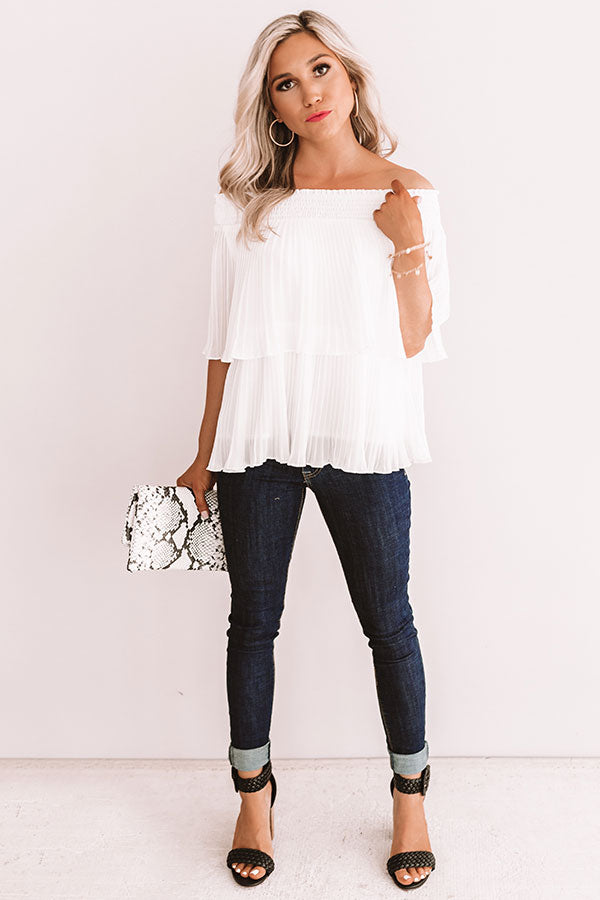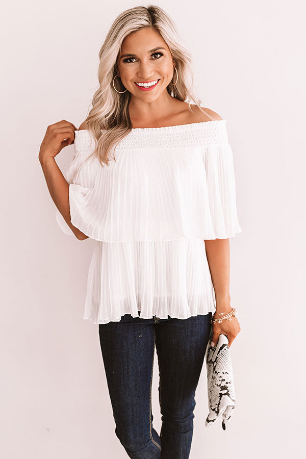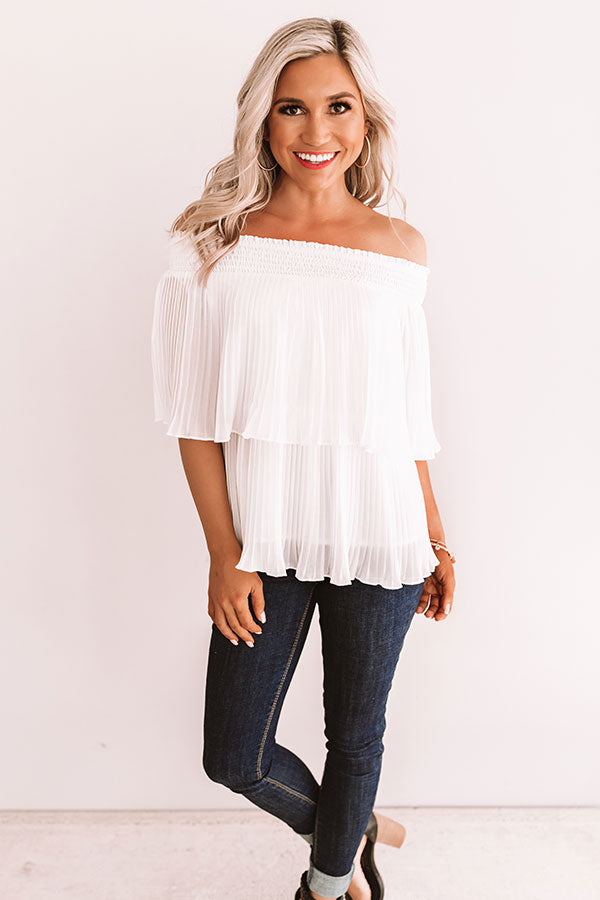 "Pass the Sangria," because we found the perfect white summer shirt! It features an elastic off-the-shoulder fit, pleated flowy layers, and a sewn in slip for full coverage! This piece can be styled with dark denim or our "Stealing The Show High Waist Trousers in Sapphire," neutral wedges, and our "Coast To Coast Cute Embroidered Tote in Blue!" Measurements