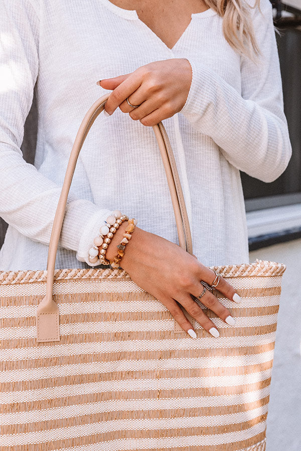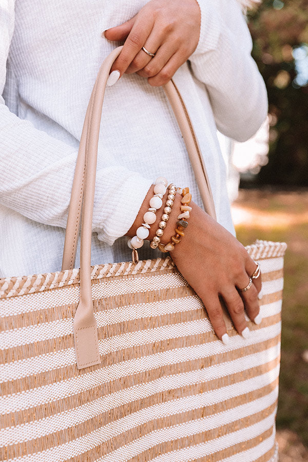 Upgrade your arm candy with our darling 'Passion Tea' three piece bracelet set featuring gold and white beads and semi precious earth hued stones!
