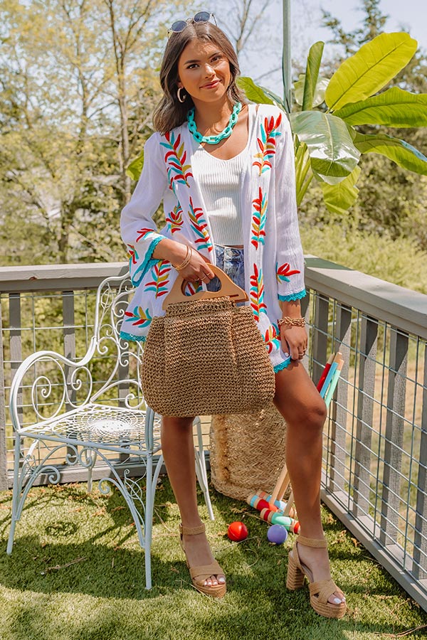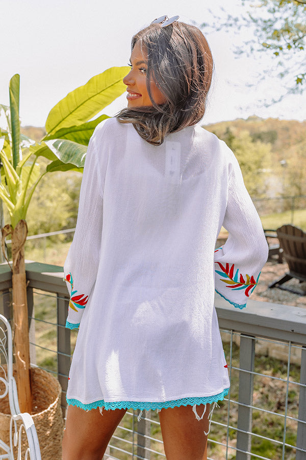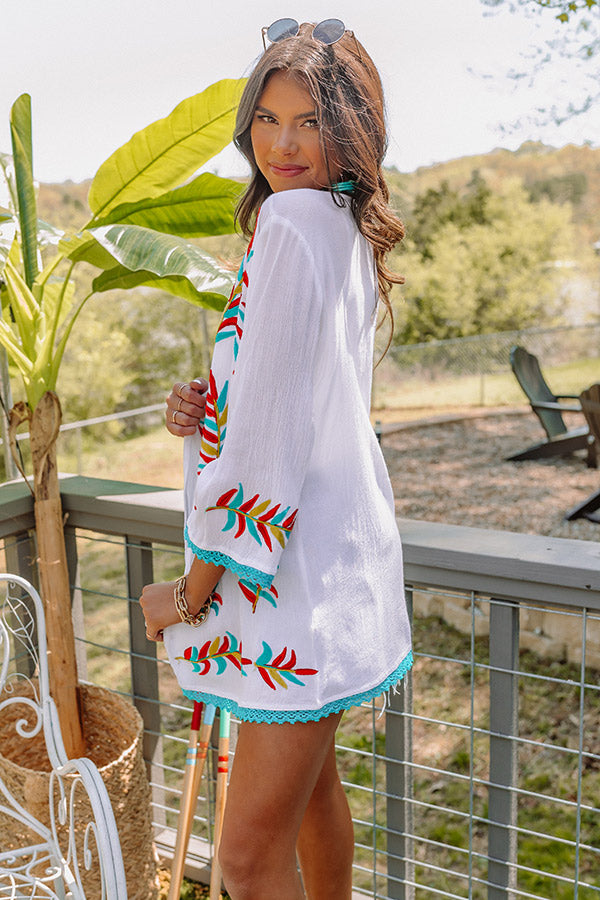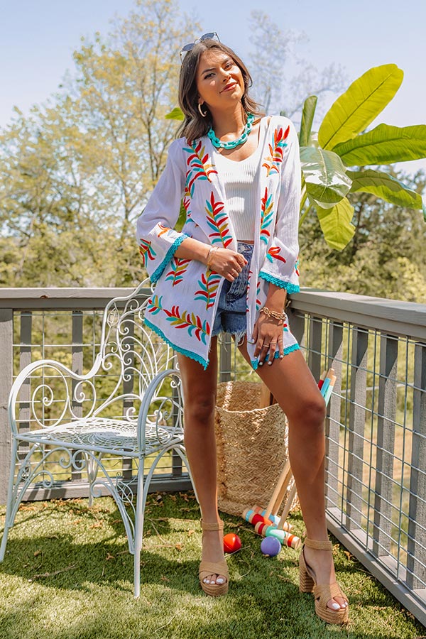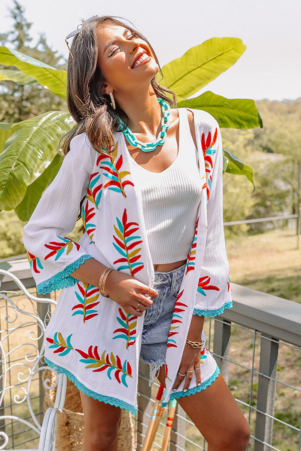 Layer up in style with our gorgeous white 'Passport To Palm Springs' overlay featuring lightweight material patterned with a turquoise, red, and golden honey embroidered leaf print, loose 3/4-length sleeves, and a draped open-front silhouette that ends in a straight mid-thigh length hemline! on products