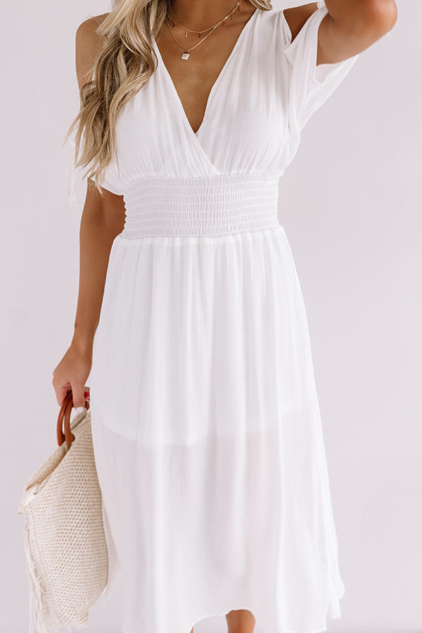 Stay looking stylish from vacay to everyday with our chic white "Passport To Prague" maxi dress featuring ultra lightweight breezy material, a wrapped bodice with a v-cut neckline, wide 2-inch shoulder straps with tie closure drop sleeves, a fitted waistline with smocked detailing, and a relaxed skirt silhouette that falls into a straight mid-calf length hemline! We have styled this dreamy piece with some neutral platform heels and a woven tote, but you can also wear it with "The Nicolette Faux Suede Wedge in Hot Pink" and our hot pink "Jetsetter Chic Hair Scarf!" Measurements