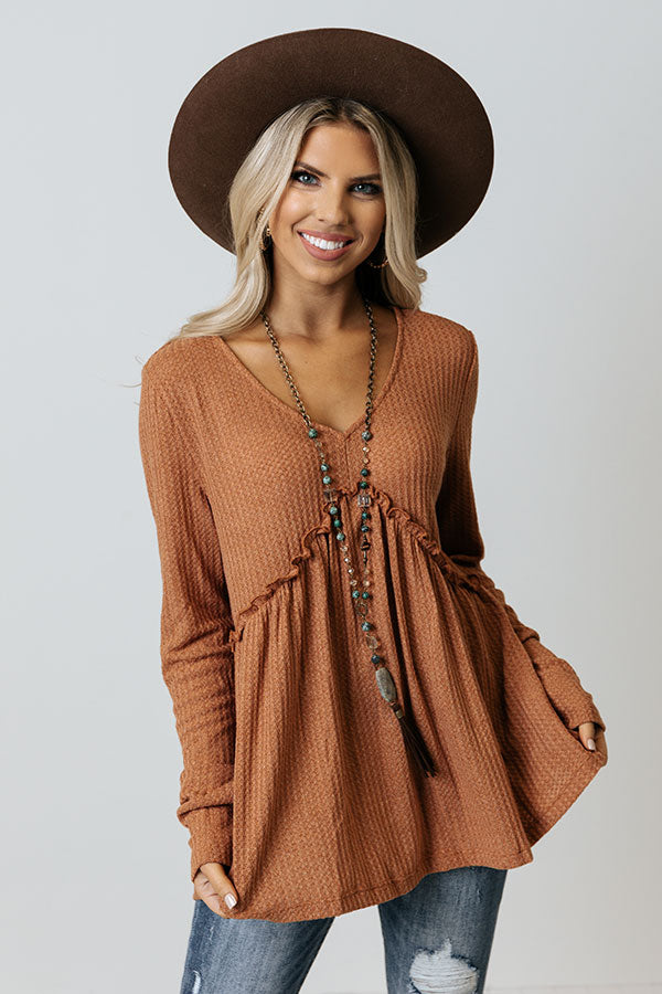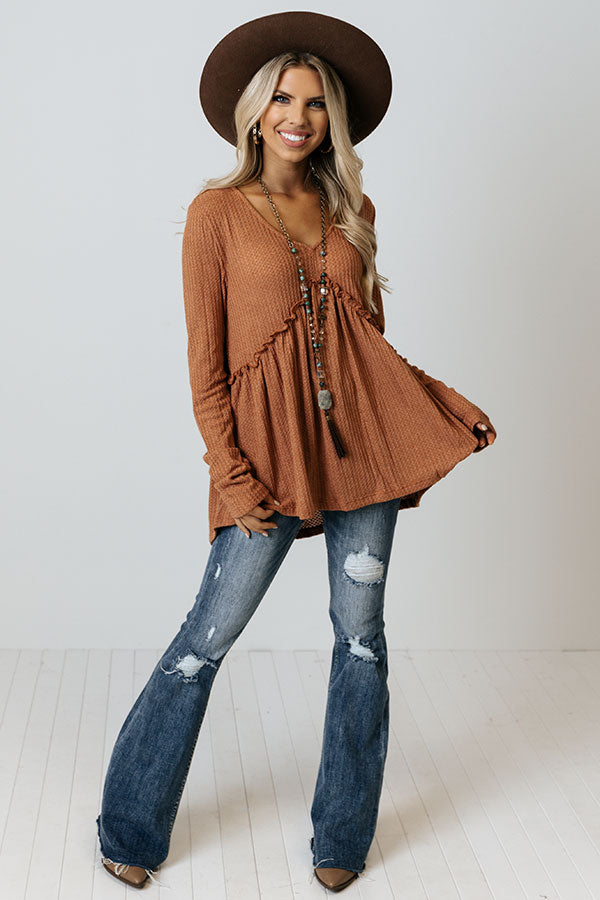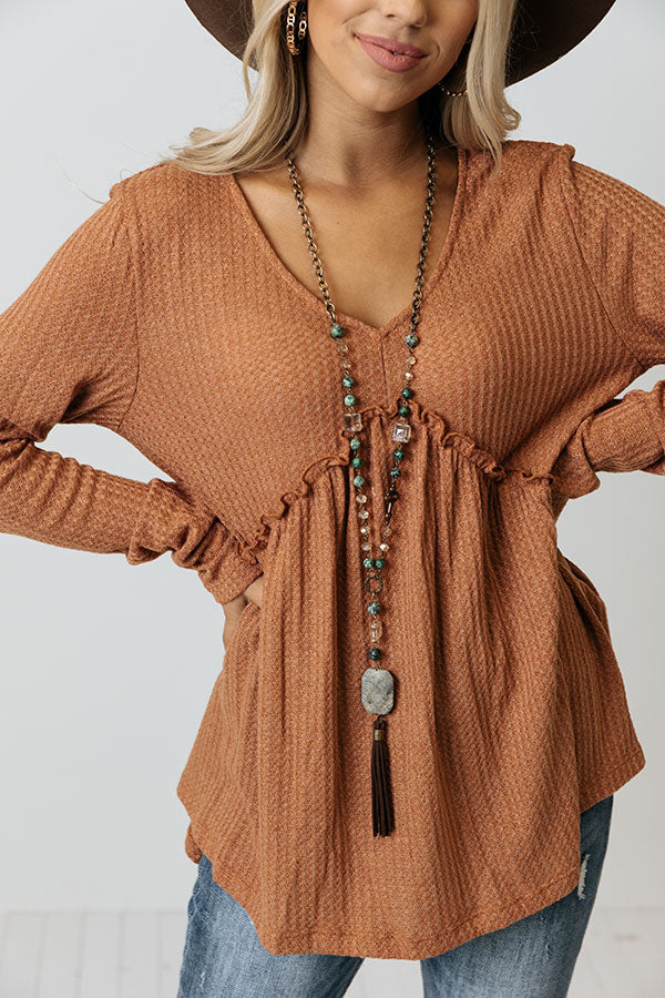 We have no doubt you will love this darling rust colored babydoll top featuring lightweight flowy material with subtle waffle knit texturing, a v-cut neckline, a ruffled accent seam at the waistline, long loose sleeves, and a relaxed babydoll silhouette that falls into a straight hemline!