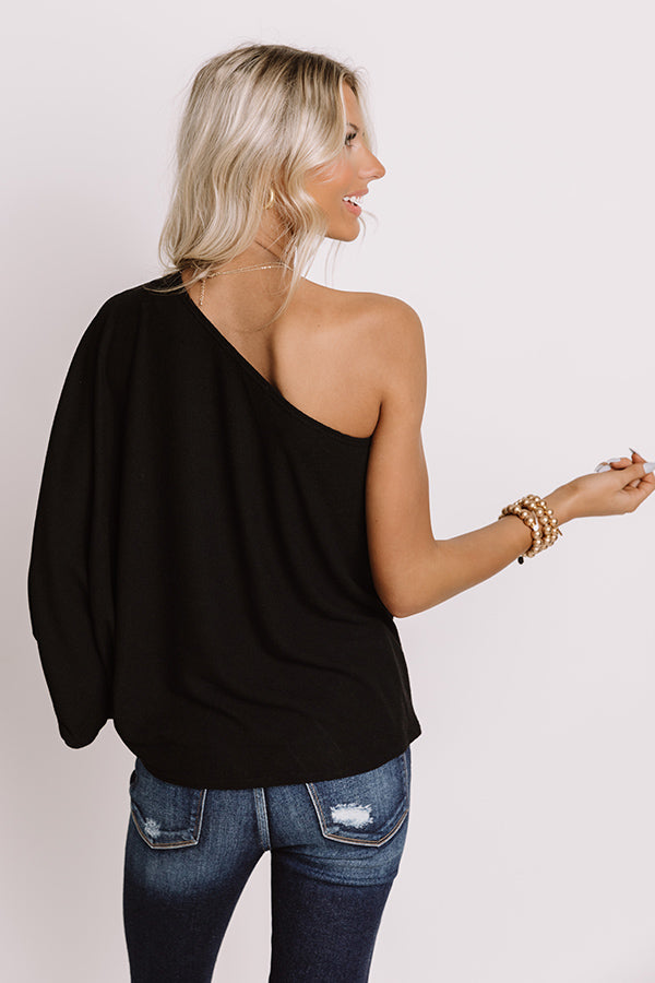 Arrive in style for a "patio brunch" with this chic little black shift top featuring lightweight flowy material, a diagonal neckline and upper back with an oversized 3/4-length bat wing sleeve , and a relaxed silhouette that falls into a straight hemline! Measurements