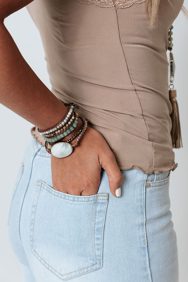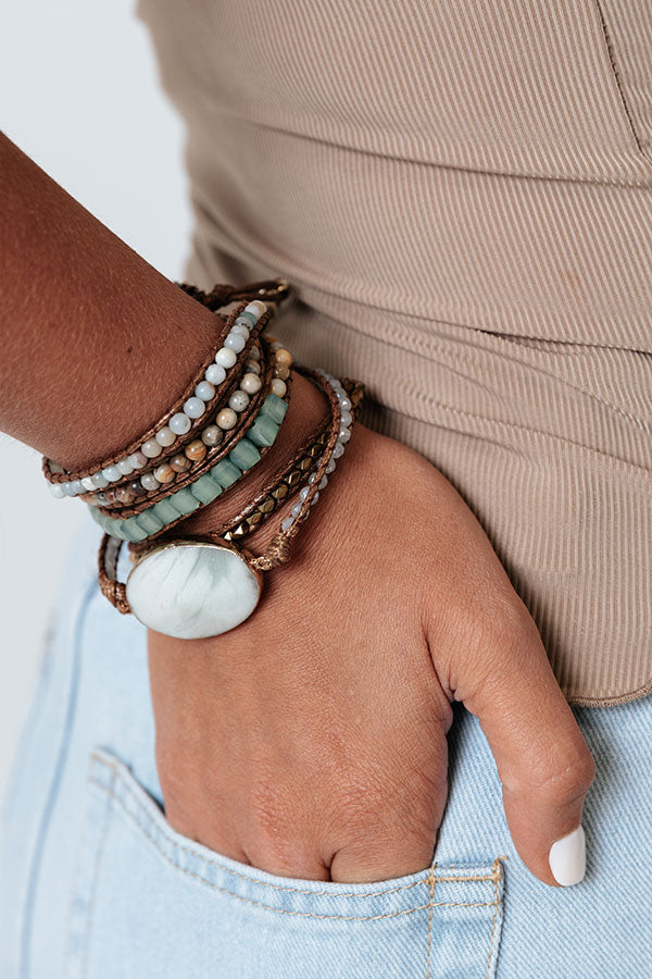 Whether you are headed to a patio party or a more elegant event, this luxurious bracelet is perfect for any occasion! It features a wrap silhouette with earth hued beads and an oval semi precious stone! Due to the use of natural stones, stones may vary in size, shape or color.