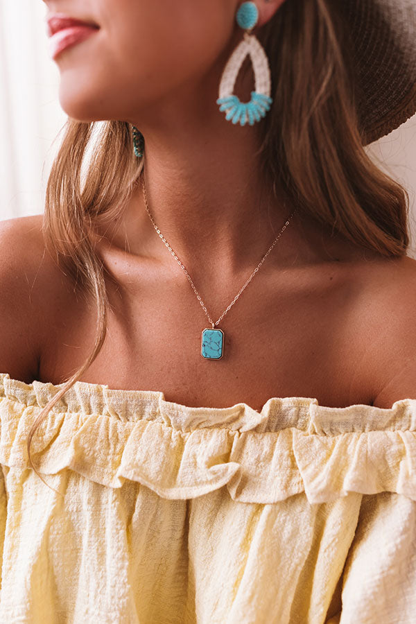 There is no better piece to wear to a "patio party" than this dainty necklace featuring a short gold chain with a rectangular turquoise faux stone charm!