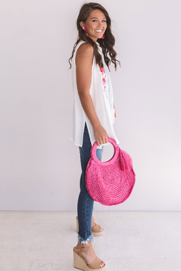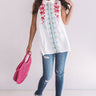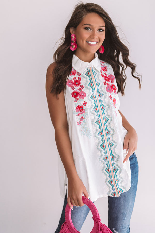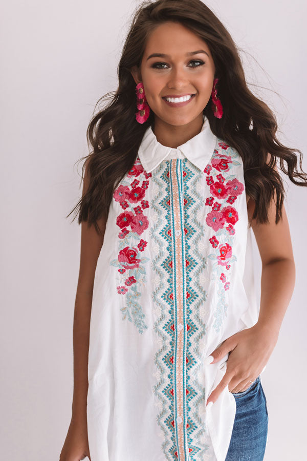 From pinot on the patio to pizza in the park, this is the perfect wear-anywhere top for all of your plans! This chic boho inspired piece has a collared neckline, a sleeveless button-down bodice that is decorated with colorful floral embroidery, and a split-sided hem. Style this top with your favorite distressed denim for a classic look with feminine flair!