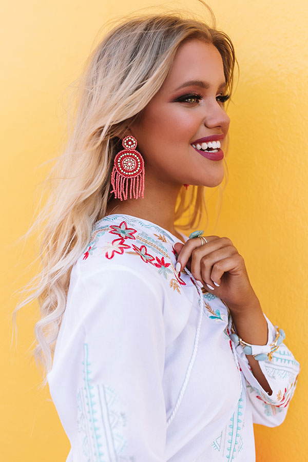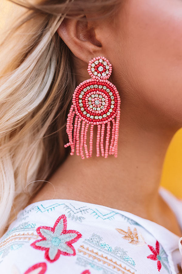 Life is too short to wear boring jewelry, so liven up your OOTD by accessorizing with our adorable "Patio, Please" statement earrings featuring colorfully beaded and rhinestones circle studs and larger dangling beaded and rhinestone circles with peach colored fringe tassels!