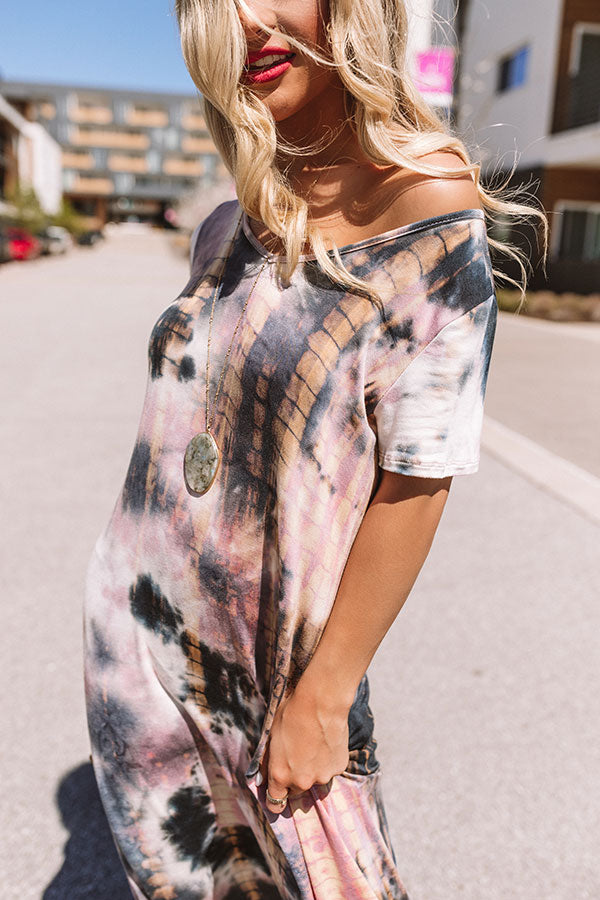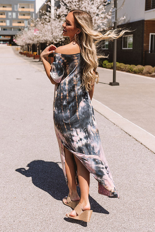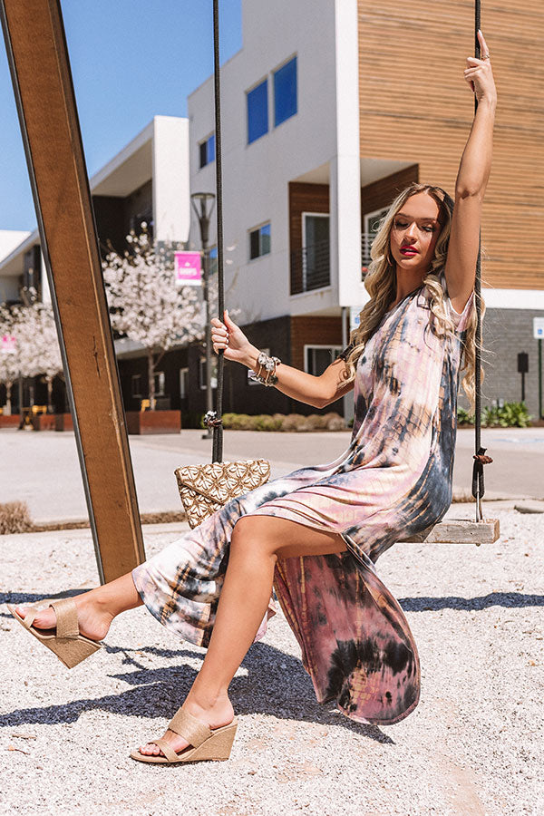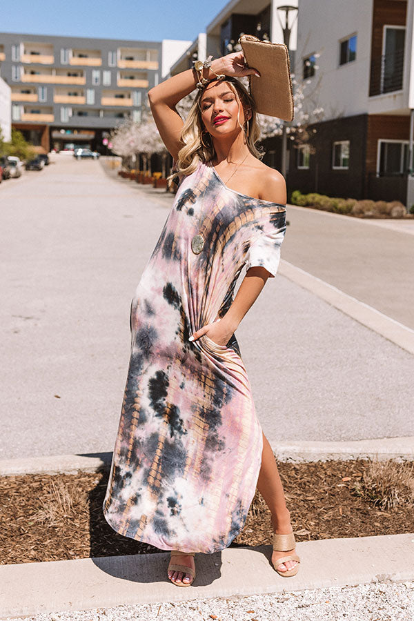 Our "Patio, Please" maxi dress is to "dye" for with its soft lightweight breezy material, dark grey, blush, and neutral hued tie dye, a wide v-cut neckline that can be worn off one shoulder, short loose sleeves, accent side pockets, and an ultra relaxed silhouette that falls into a rounded floor-length hemline with thigh high slits! We have styled this eye-catching piece with some neutral wedges and a matching clutch, but you can also wear it layered under a denim jacket with "The Melina Heel in White" and our "Quay X JLO Reina Cat Eye Sunnies in Ivory!" Measurements