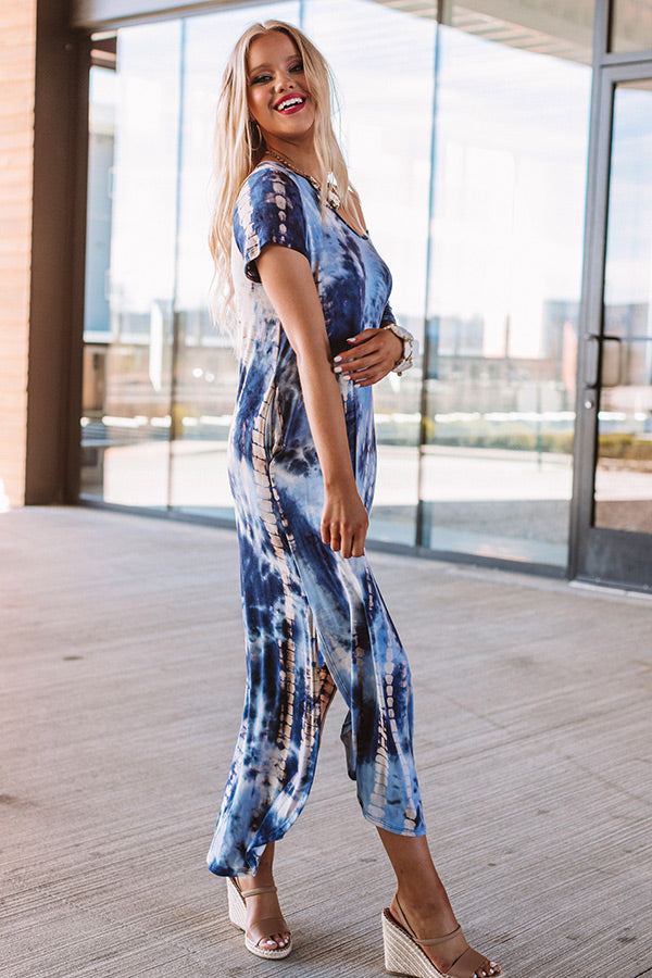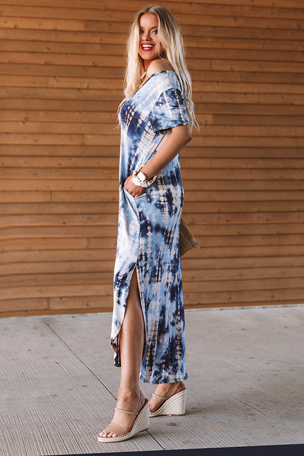 Our "Patio, Please" maxi dress is to "dye" for with its soft lightweight breezy material, white and navy tie dye, a wide v-cut neckline that can be worn off one shoulder, short loose sleeves, accent side pockets, and an ultra relaxed silhouette that falls into a rounded floor-length hemline with thigh high slits! We have styled this eye-catching piece with a statement necklace, neutral wedges, and a matching clutch, but you can also wear it layered under a denim jacket with "The Melina Heel in White" and our "Quay X JLO Reina Cat Eye Sunnies in Ivory!" Measurements