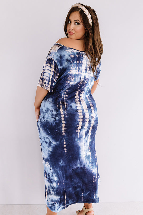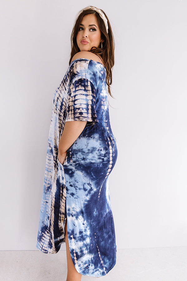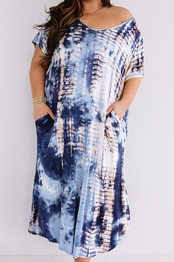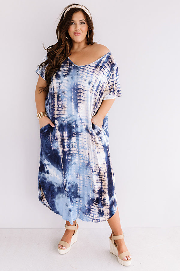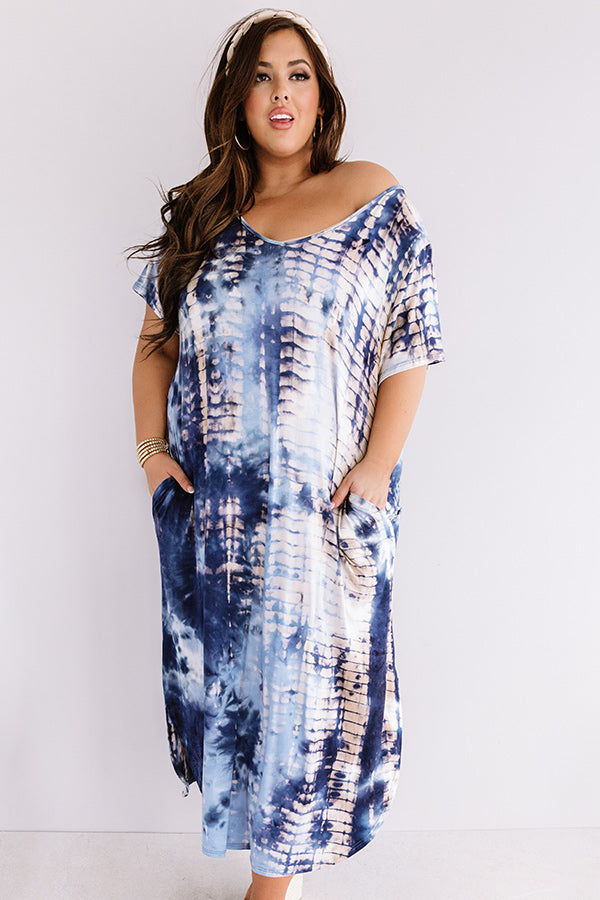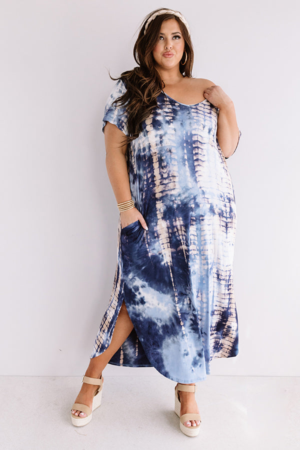 Plus Size - Our "Patio, Please" maxi dress is to "dye" for with its soft lightweight breezy material, white and navy tie dye, a wide v-cut neckline that can be worn off one shoulder, short loose sleeves, accent side pockets, and an ultra relaxed silhouette that falls into a rounded floor-length hemline with thigh high slits! We have styled this eye-catching piece with a neutral wedge and headband, but you can also wear it with "The Melina Heel in White" and our "Quay X JLO Reina Cat Eye Sunnies in Ivory!" Measurements