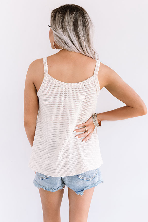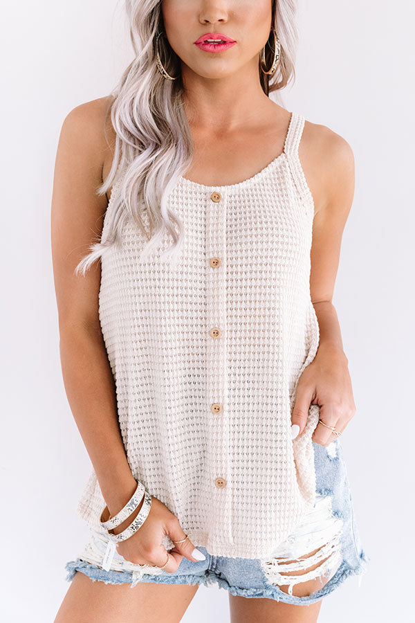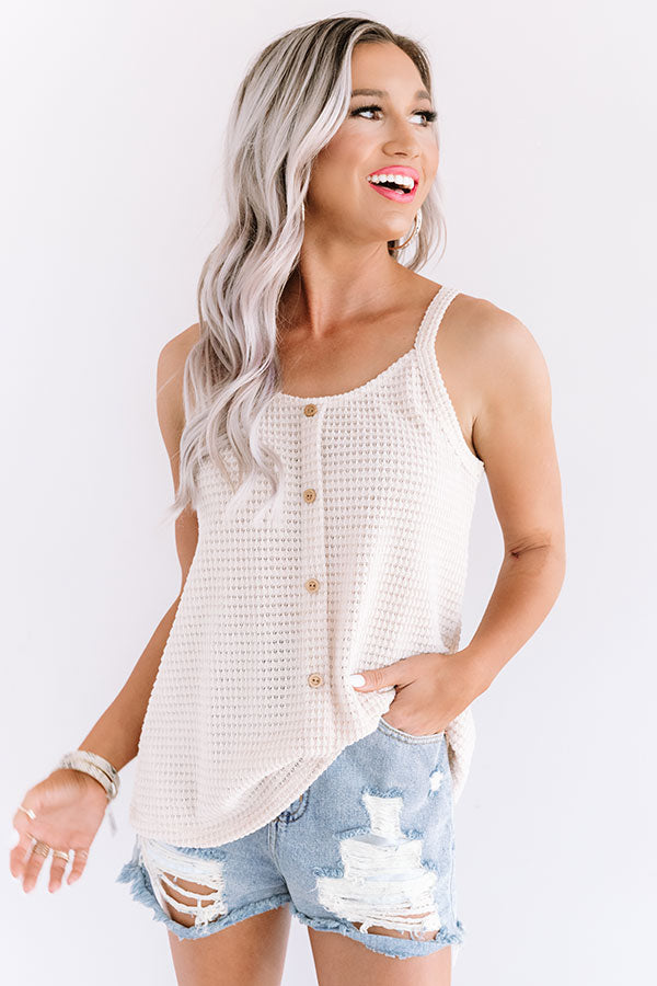 You are guaranteed to look pretty when you wear this casual birch colored tank featuring lightweight material patterned with subtle waffle knit texturing, a rounded neckline with spaghetti shoulder straps, a button down front, and a relaxed silhouette that falls into an uneven hemline! This cutie can be styled a variety of ways, like solo with some distressed ankle skinnies, snake print block heels, and a sage tote, or you can wear it layered under a denim jacket with some black flares, sunnies, and "The Roxana Lace Up Wedge in Iced Latte!"