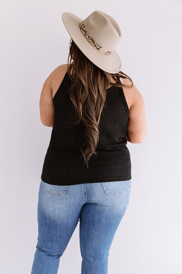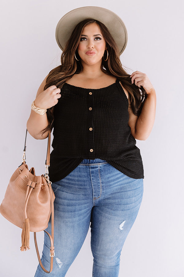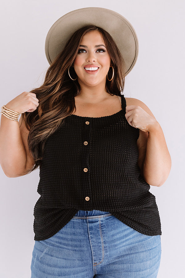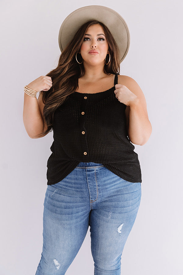Plus Size - You are guaranteed to look pretty when you wear this casual black tank featuring lightweight material patterned with subtle waffle knit texturing, a rounded neckline with spaghetti shoulder straps, a button down front, and a relaxed silhouette that falls into an uneven hemline! This cutie can be styled a variety of ways, like solo with some skinnies, a faux suede hat, and a neutral jute wedge and bucket bag, or you can wear it layered under a denim jacket with some white flares, sunnies, and "The Tory Snake Print Heel!" Measurements
