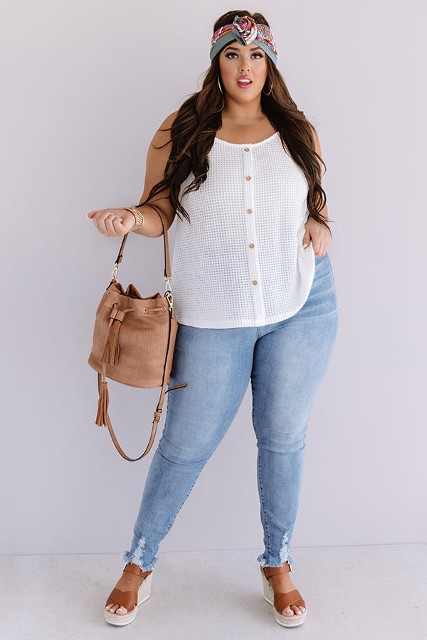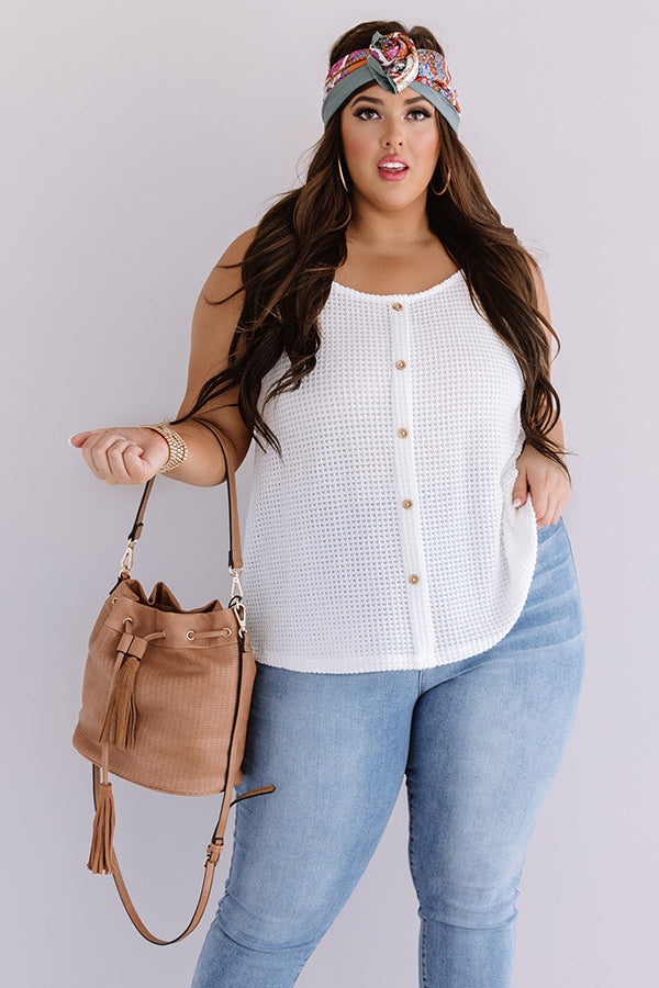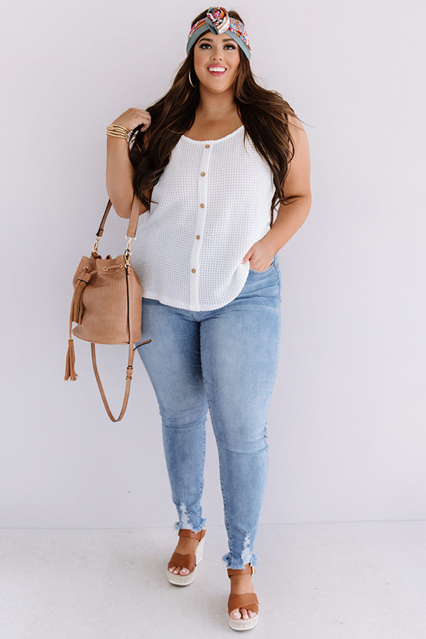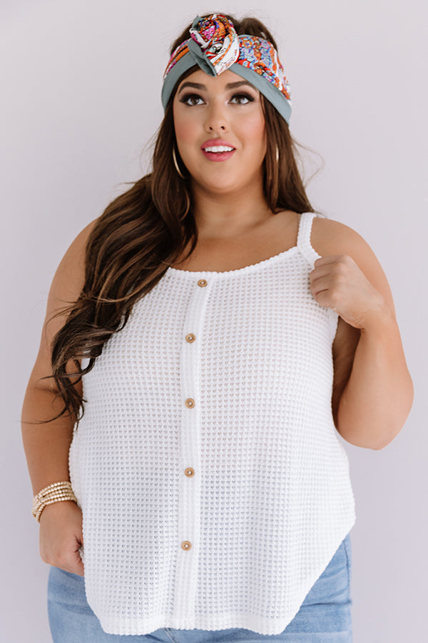 Plus Size - You are guaranteed to look pretty when you wear this casual white tank featuring lightweight material patterned with subtle waffle knit texturing, a rounded neckline with spaghetti shoulder straps, a button down front, and a relaxed silhouette that falls into an uneven hemline! This cutie can be styled a variety of ways, like solo with some trendy ankle skinnies, an accent hair scarf, and a neutral wedge and bucket bag, or you can wear it layered under a denim jacket with some black flares, sunnies, and "The Tory Snake Print Heel!" Measurements