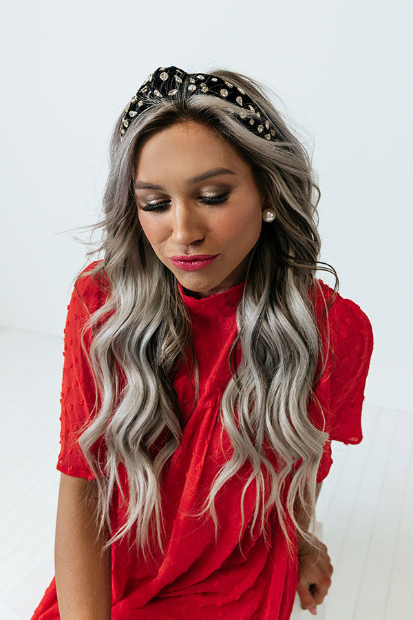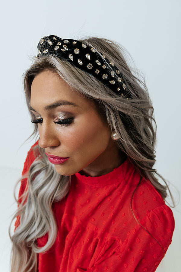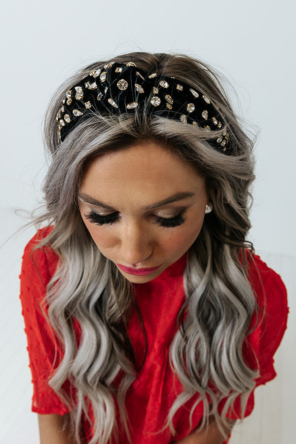 Add a pop of glam to your look with our stunning 'Pause And Reflect Headband, featuring a wide black silhouette with colorful rhinestone detailing and an accent top knot!